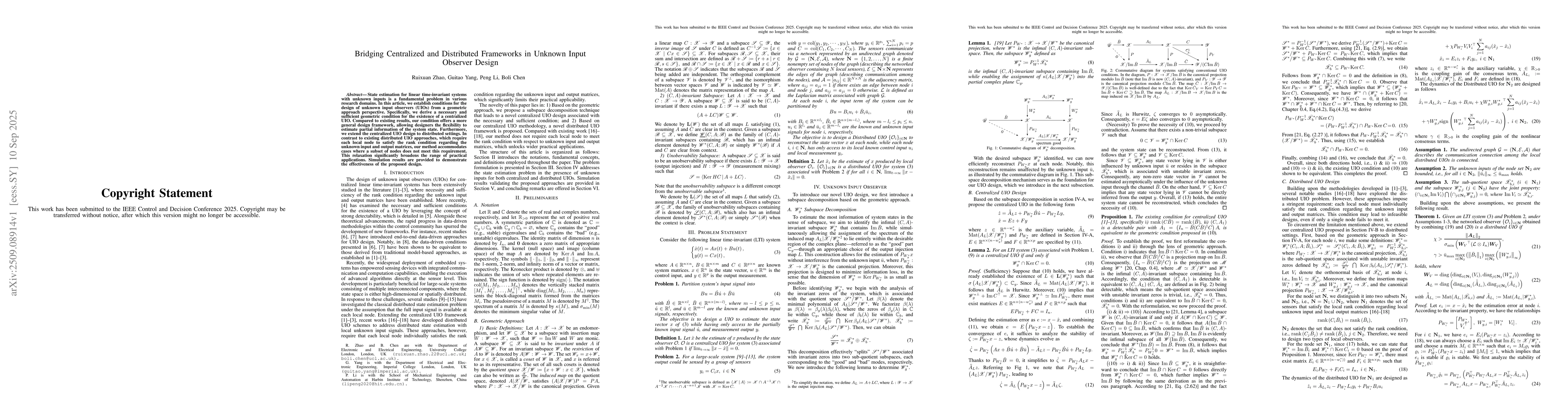 State estimation for linear time-invariant systems with unknown inputs is a fundamental problem in various research domains. In this article, we establish conditions for the design of unknown input observers (UIOs) from a geometric approach perspective. Specifically, we derive a necessary and sufficient geometric condition for the existence of a centralized UIO. Compared to existing results, our condition offers a more general design framework, allowing designers the flexibility to estimate partial information of the system state. Furthermore, we extend the centralized UIO design to distributed settings. In contrast to existing distributed UIO approaches, which require each local node to satisfy the rank condition regarding the unknown input and output matrices, our method accommodates cases where a subset of nodes does not meet this requirement. This relaxation significantly broadens the range of practical applications. Simulation results are provided to demonstrate the effectiveness of the proposed design.