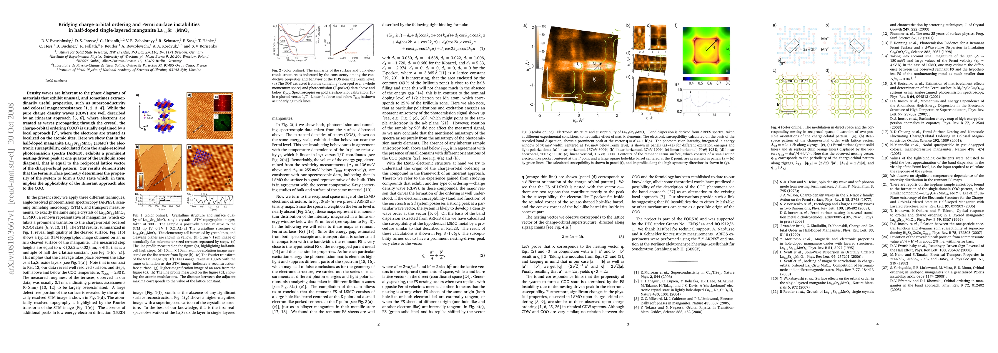 Density waves are inherent to the phase diagrams of materials that exhibit unusual, and sometimes extraordinarily useful properties, such as superconductivity and colossal magnetoresistance. While the pure charge density waves (CDW) are well described by an itinerant approach, where electrons are treated as waves propagating through the crystal, the charge-orbital ordering (COO) is usually explained by a local approach, where the electrons are treated as localized on the atomic sites. Here we show that in the half-doped manganite La0.5Sr1.5MnO4 (LSMO) the electronic susceptibility, calculated from the angle-resolved photoemission spectra (ARPES), exhibits a prominent nesting-driven peak at one quarter of the Brillouin zone diagonal, that is equal to the reciprocal lattice vector of the charge-orbital pattern. Our results demonstrate that the Fermi surface geometry determines the propensity of the system to form a COO state which, in turn, implies the applicability of the itinerant approach also to the COO.