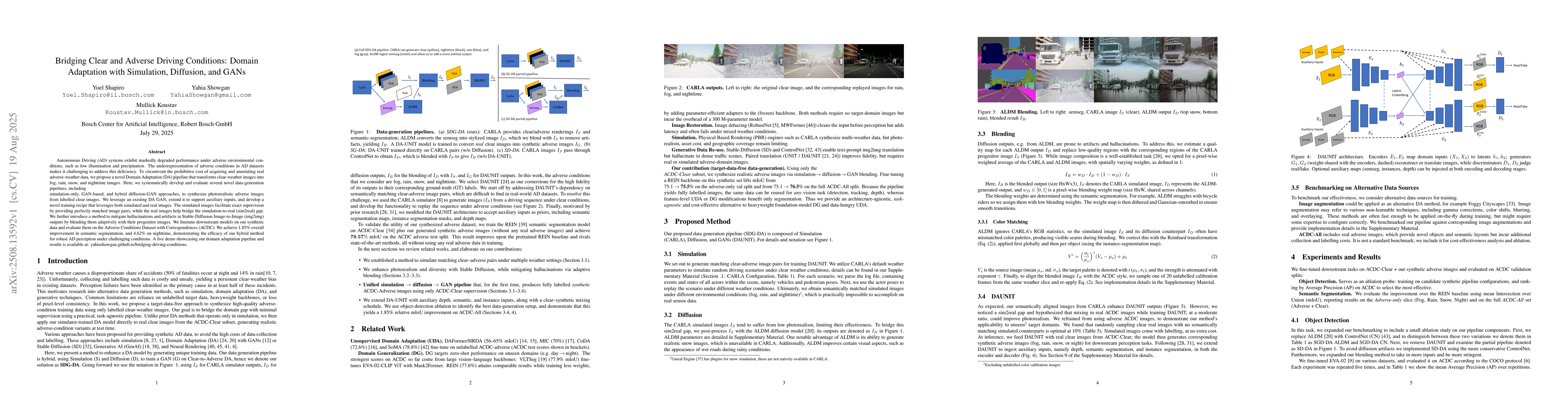 Autonomous Driving (AD) systems exhibit markedly degraded performance under adverse environmental conditions, such as low illumination and precipitation. The underrepresentation of adverse conditions in AD datasets makes it challenging to address this deficiency. To circumvent the prohibitive cost of acquiring and annotating adverse weather data, we propose a novel Domain Adaptation (DA) pipeline that transforms clear-weather images into fog, rain, snow, and nighttime images. Here, we systematically develop and evaluate several novel data-generation pipelines, including simulation-only, GAN-based, and hybrid diffusion-GAN approaches, to synthesize photorealistic adverse images from labelled clear images. We leverage an existing DA GAN, extend it to support auxiliary inputs, and develop a novel training recipe that leverages both simulated and real images. The simulated images facilitate exact supervision by providing perfectly matched image pairs, while the real images help bridge the simulation-to-real (sim2real) gap. We further introduce a method to mitigate hallucinations and artifacts in Stable-Diffusion Image-to-Image (img2img) outputs by blending them adaptively with their progenitor images. We finetune downstream models on our synthetic data and evaluate them on the Adverse Conditions Dataset with Correspondences (ACDC). We achieve 1.85 percent overall improvement in semantic segmentation, and 4.62 percent on nighttime, demonstrating the efficacy of our hybrid method for robust AD perception under challenging conditions.