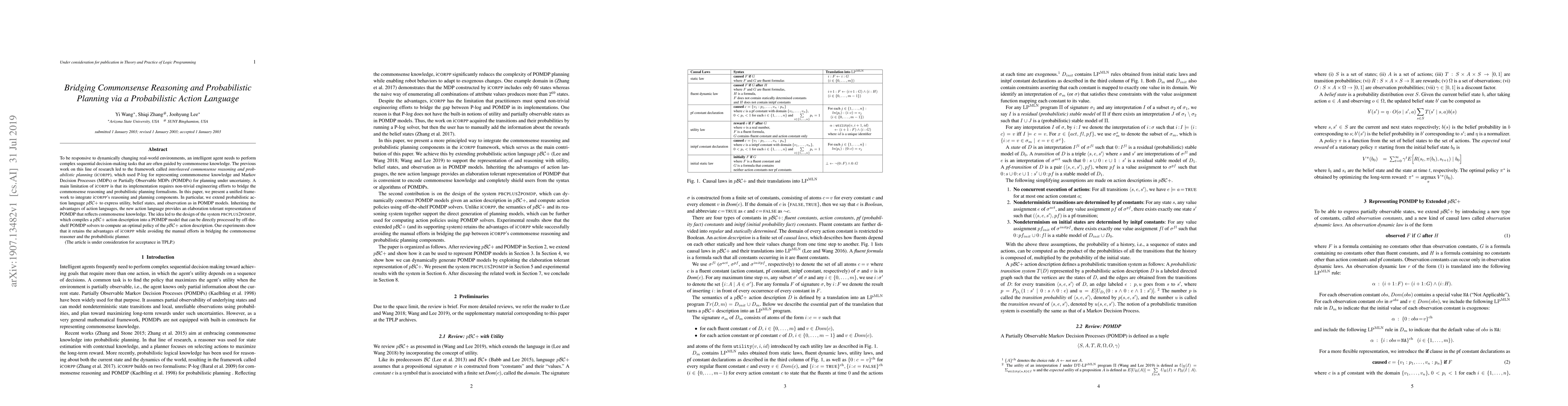 This paper proposes a unified framework integrating commonsense reasoning and probabilistic planning by extending probabilistic action language pBC+ to express utility, belief states, and observations. The system pbcplus2pomdp compiles pBC+ descriptions into POMDP models, facilitating optimal policy computation without manual bridging efforts.