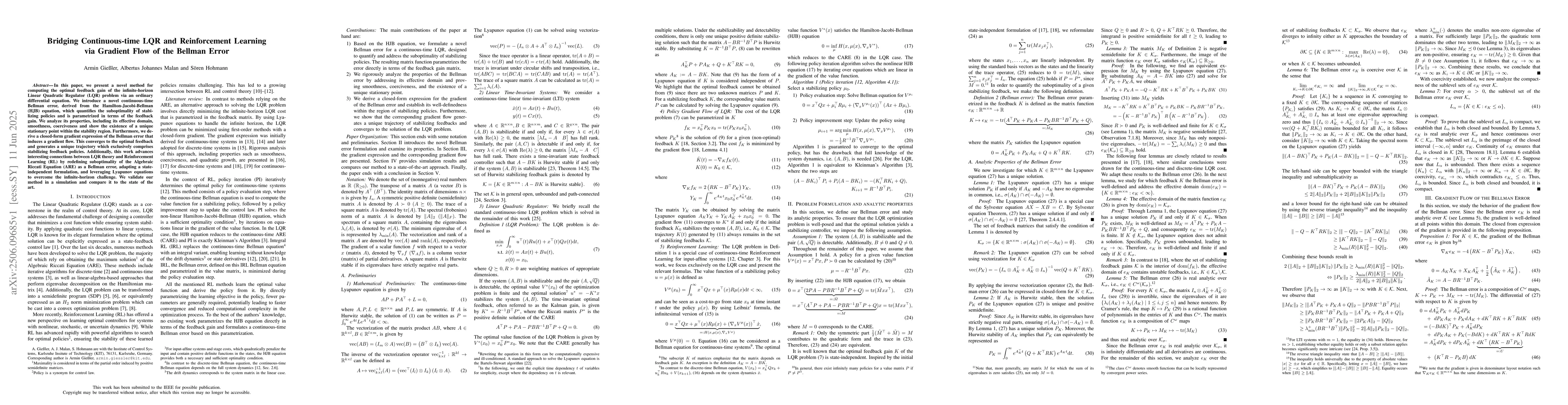 In this paper, we present a novel method for computing the optimal feedback gain of the infinite-horizon Linear Quadratic Regulator (LQR) problem via an ordinary differential equation. We introduce a novel continuous-time Bellman error, derived from the Hamilton-Jacobi-Bellman (HJB) equation, which quantifies the suboptimality of stabilizing policies and is parametrized in terms of the feedback gain. We analyze its properties, including its effective domain, smoothness, coerciveness and show the existence of a unique stationary point within the stability region. Furthermore, we derive a closed-form gradient expression of the Bellman error that induces a gradient flow. This converges to the optimal feedback and generates a unique trajectory which exclusively comprises stabilizing feedback policies. Additionally, this work advances interesting connections between LQR theory and Reinforcement Learning (RL) by redefining suboptimality of the Algebraic Riccati Equation (ARE) as a Bellman error, adapting a state-independent formulation, and leveraging Lyapunov equations to overcome the infinite-horizon challenge. We validate our method in a simulation and compare it to the state of the art.