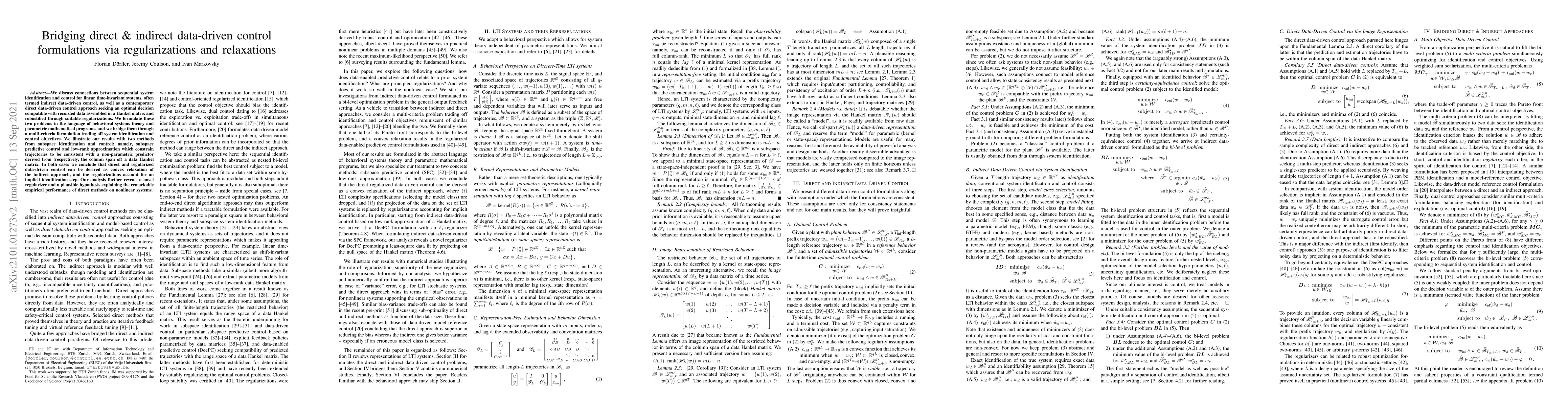 We discuss connections between sequential system identification and control for linear time-invariant systems, often termed indirect data-driven control, as well as a contemporary direct data-driven control approach seeking an optimal decision compatible with recorded data assembled in a Hankel matrix and robustified through suitable regularizations. We formulate these two problems in the language of behavioral systems theory and parametric mathematical programs, and we bridge them through a multi-criteria formulation trading off system identification and control objectives. We illustrate our results with two methods from subspace identification and control: namely, subspace predictive control and low-rank approximation which constrain trajectories to be consistent with a non-parametric predictor derived from (respectively, the column span of) a data Hankel matrix. In both cases we conclude that direct and regularized data-driven control can be derived as convex relaxation of the indirect approach, and the regularizations account for an implicit identification step. Our analysis further reveals a novel regularizer and a plausible hypothesis explaining the remarkable empirical performance of direct methods on nonlinear systems.
