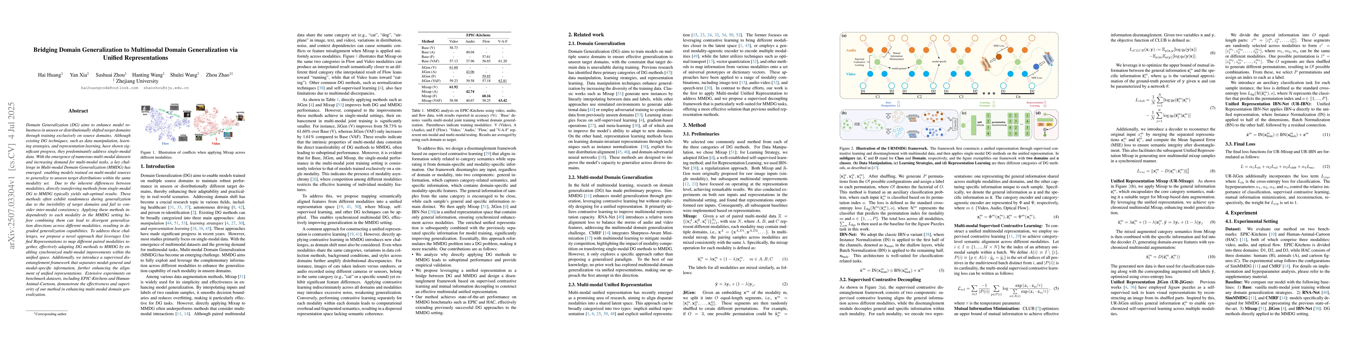 Domain Generalization (DG) aims to enhance model robustness in unseen or distributionally shifted target domains through training exclusively on source domains. Although existing DG techniques, such as data manipulation, learning strategies, and representation learning, have shown significant progress, they predominantly address single-modal data. With the emergence of numerous multi-modal datasets and increasing demand for multi-modal tasks, a key challenge in Multi-modal Domain Generalization (MMDG) has emerged: enabling models trained on multi-modal sources to generalize to unseen target distributions within the same modality set. Due to the inherent differences between modalities, directly transferring methods from single-modal DG to MMDG typically yields sub-optimal results. These methods often exhibit randomness during generalization due to the invisibility of target domains and fail to consider inter-modal consistency. Applying these methods independently to each modality in the MMDG setting before combining them can lead to divergent generalization directions across different modalities, resulting in degraded generalization capabilities. To address these challenges, we propose a novel approach that leverages Unified Representations to map different paired modalities together, effectively adapting DG methods to MMDG by enabling synchronized multi-modal improvements within the unified space. Additionally, we introduce a supervised disentanglement framework that separates modal-general and modal-specific information, further enhancing the alignment of unified representations. Extensive experiments on benchmark datasets, including EPIC-Kitchens and Human-Animal-Cartoon, demonstrate the effectiveness and superiority of our method in enhancing multi-modal domain generalization.