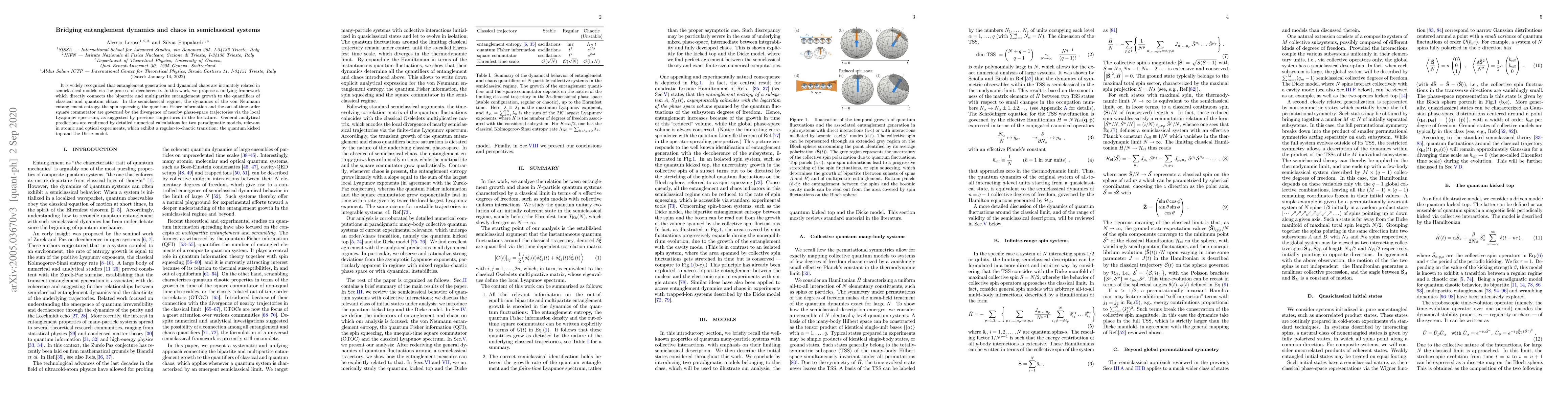 It is widely recognized that entanglement generation and dynamical chaos are intimately related in semiclassical models via the process of decoherence. In this work, we propose a unifying framework which directly connects the bipartite and multipartite entanglement growth to the quantifiers of classical and quantum chaos. In the semiclassical regime, the dynamics of the von Neumann entanglement entropy, the spin squeezing, the quantum Fisher information and the out-of-time-order square commutator are governed by the divergence of nearby phase-space trajectories via the local Lyapunov spectrum, as suggested by previous conjectures in the literature. General analytical predictions are confirmed by detailed numerical calculations for two paradigmatic models, relevant in atomic and optical experiments, which exhibit a regular-to-chaotic transition: the quantum kicked top and the Dicke model.