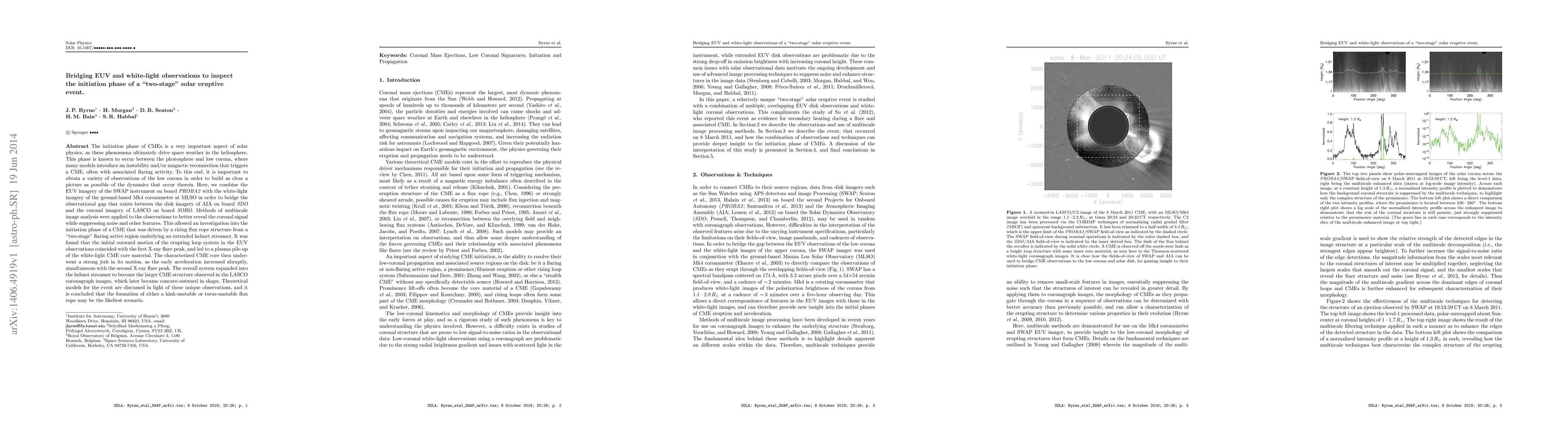 The initiation phase of CMEs is a very important aspect of solar physics, as these phenomena ultimately drive space weather in the heliosphere. This phase is known to occur between the photosphere and low corona, where many models introduce an instability and/or magnetic reconnection that triggers a CME, often with associated flaring activity. To this end, it is important to obtain a variety of observations of the low corona in order to build as clear a picture as possible of the dynamics that occur therein. Here, we combine the EUV imagery of the SWAP instrument on board PROBA2 with the white-light imagery of the ground-based Mk4 coronameter at MLSO in order to bridge the observational gap that exists between the disk imagery of AIA on board SDO and the coronal imagery of LASCO on board SOHO. Methods of multiscale image analysis were applied to the observations to better reveal the coronal signal while suppressing noise and other features. This allowed an investigation into the initiation phase of a CME that was driven by a rising flux rope structure from a "two-stage" flaring active region underlying an extended helmet streamer. It was found that the initial outward motion of the erupting loop system in the EUV observations coincided with the first X-ray flare peak, and led to a plasma pile-up of the white-light CME core material. The characterized CME core then underwent a strong jerk in its motion, as the early acceleration increased abruptly, simultaneous with the second X-ray flare peak. The overall system expanded into the helmet streamer to become the larger CME structure observed in the LASCO coronagraph images, which later became concave-outward in shape. Theoretical models for the event are discussed in light of these unique observations, and it is concluded that the formation of either a kink-unstable or torus-unstable flux rope may be the likeliest scenario.