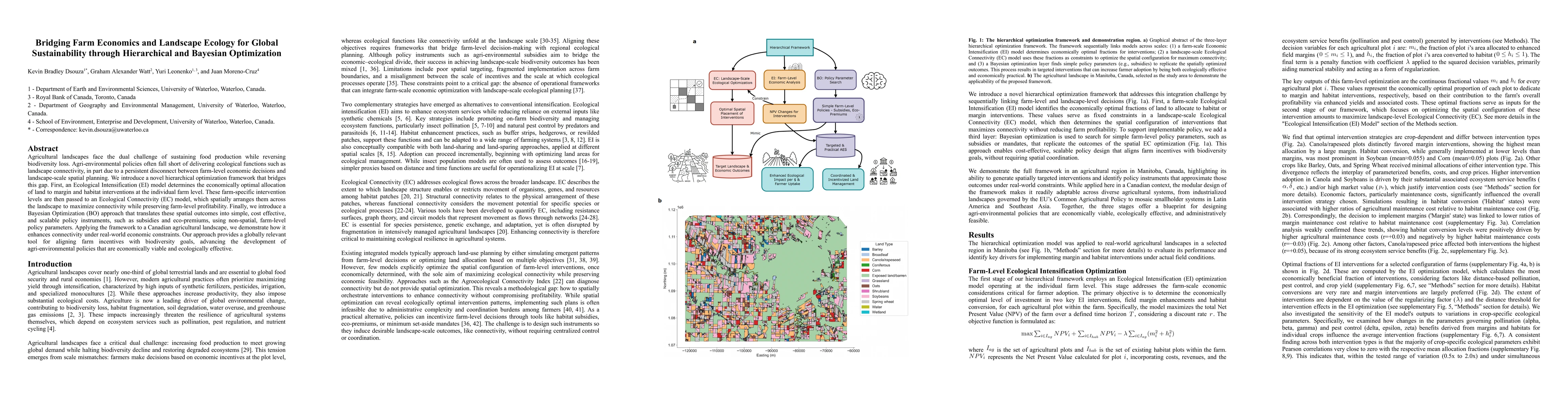 The research introduces a hierarchical optimization framework that bridges the gap between farm-level economic decisions and landscape-scale spatial planning. It combines Ecological Intensification (EI) and Ecological Connectivity (EC) models, and employs Bayesian Optimization (BO) to translate spatial outcomes into cost-effective policy instruments.