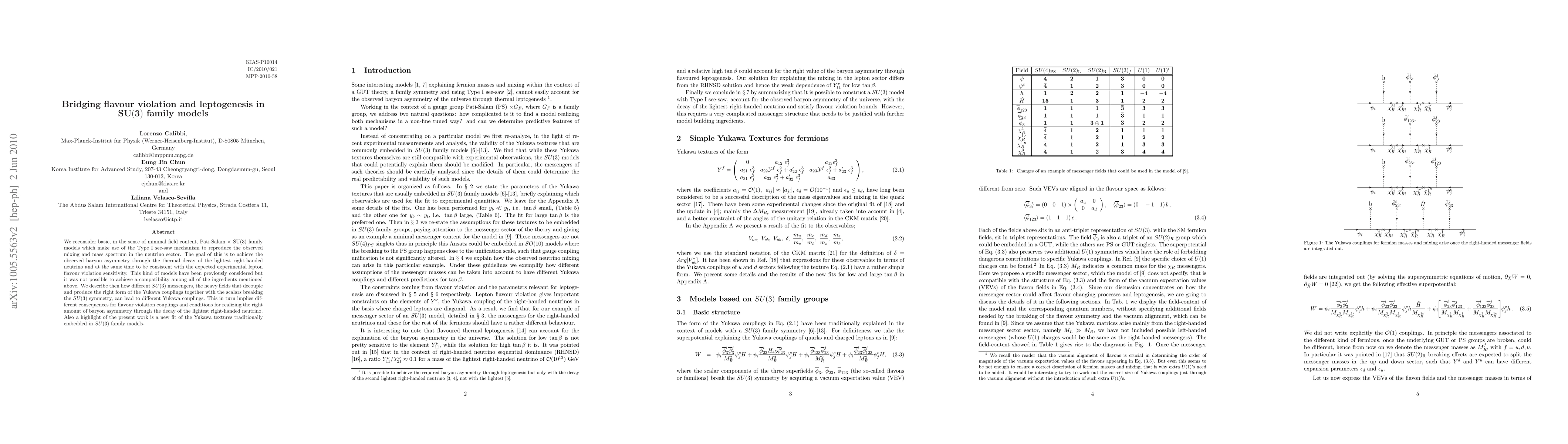 We reconsider basic, in the sense of minimal field content, Pati-Salam x SU(3) family models which make use of the Type I see-saw mechanism to reproduce the observed mixing and mass spectrum in the neutrino sector. The goal of this is to achieve the observed baryon asymmetry through the thermal decay of the lightest right-handed neutrino and at the same time to be consistent with the expected experimental lepton flavour violation sensitivity. This kind of models have been previously considered but it was not possible to achieve a compatibility among all of the ingredients mentioned above. We describe then how different SU(3) messengers, the heavy fields that decouple and produce the right form of the Yukawa couplings together with the scalars breaking the SU(3) symmetry, can lead to different Yukawa couplings. This in turn implies different consequences for flavour violation couplings and conditions for realizing the right amount of baryon asymmetry through the decay of the lightest right-handed neutrino. Also a highlight of the present work is a new fit of the Yukawa textures traditionally embedded in SU(3) family models.