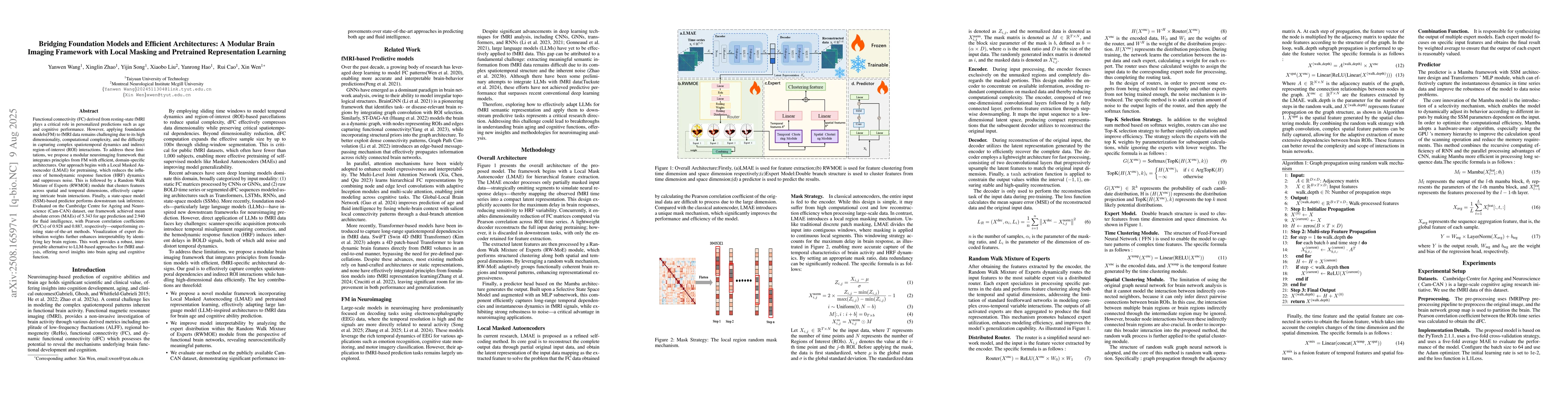 Functional connectivity (FC) derived from resting-state fMRI plays a critical role in personalized predictions such as age and cognitive performance. However, applying foundation models(FM) to fMRI data remains challenging due to its high dimensionality, computational complexity, and the difficulty in capturing complex spatiotemporal dynamics and indirect region-of-interest (ROI) interactions. To address these limitations, we propose a modular neuroimaging framework that integrates principles from FM with efficient, domain-specific architectures. Our approach begins with a Local Masked Autoencoder (LMAE) for pretraining, which reduces the influence of hemodynamic response function (HRF) dynamics and suppresses noise. This is followed by a Random Walk Mixture of Experts (RWMOE) module that clusters features across spatial and temporal dimensions, effectively capturing intricate brain interactions. Finally, a state-space model (SSM)-based predictor performs downstream task inference. Evaluated on the Cambridge Centre for Ageing and Neuroscience (Cam-CAN) dataset, our framework achieved mean absolute errors (MAEs) of 5.343 for age prediction and 2.940 for fluid intelligence, with Pearson correlation coefficients (PCCs) of 0.928 and 0.887, respectively-outperforming existing state-of-the-art methods. Visualization of expert distribution weights further enhances interpretability by identifying key brain regions. This work provides a robust, interpretable alternative to LLM-based approaches for fMRI analysis, offering novel insights into brain aging and cognitive function.