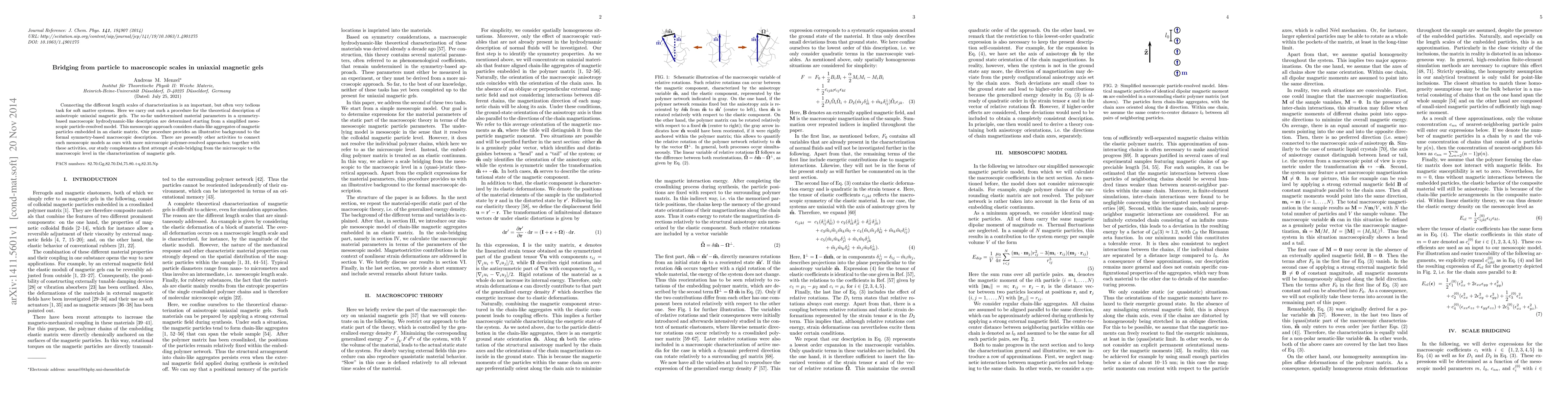 Connecting the different length scales of characterization is an important, but often very tedious task for soft matter systems. Here we carry out such a procedure for the theoretical description of anisotropic uniaxial magnetic gels. The so-far undetermined material parameters in a symmetry-based macroscopic hydrodynamic-like description are determined starting from a simplified mesoscopic particle-resolved model. This mesoscopic approach considers chain-like aggregates of magnetic particles embedded in an elastic matrix. Our procedure provides an illustrative background to the formal symmetry-based macroscopic description. There are presently other activities to connect such mesoscopic models as ours with more microscopic polymer-resolved approaches; together with these activities, our study complements a first attempt of scale-bridging from the microscopic to the macroscopic level in the characterization of magnetic gels.