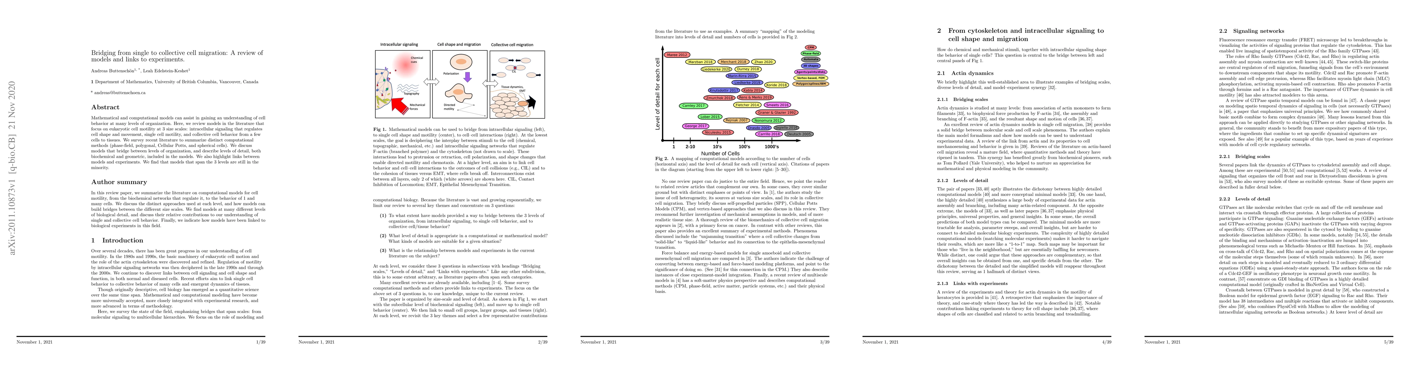 Mathematical and computational models can assist in gaining an understanding of cell behavior at many levels of organization. Here, we review models in the literature that focus on eukaryotic cell motility at 3 size scales: intracellular signaling that regulates cell shape and movement, single cell motility, and collective cell behavior from a few cells to tissues. We survey recent literature to summarize distinct computational methods (phase-field, polygonal, Cellular Potts, and spherical cells). We discuss models that bridge between levels of organization, and describe levels of detail, both biochemical and geometric, included in the models. We also highlight links between models and experiments. We find that models that span the 3 levels are still in the minority.