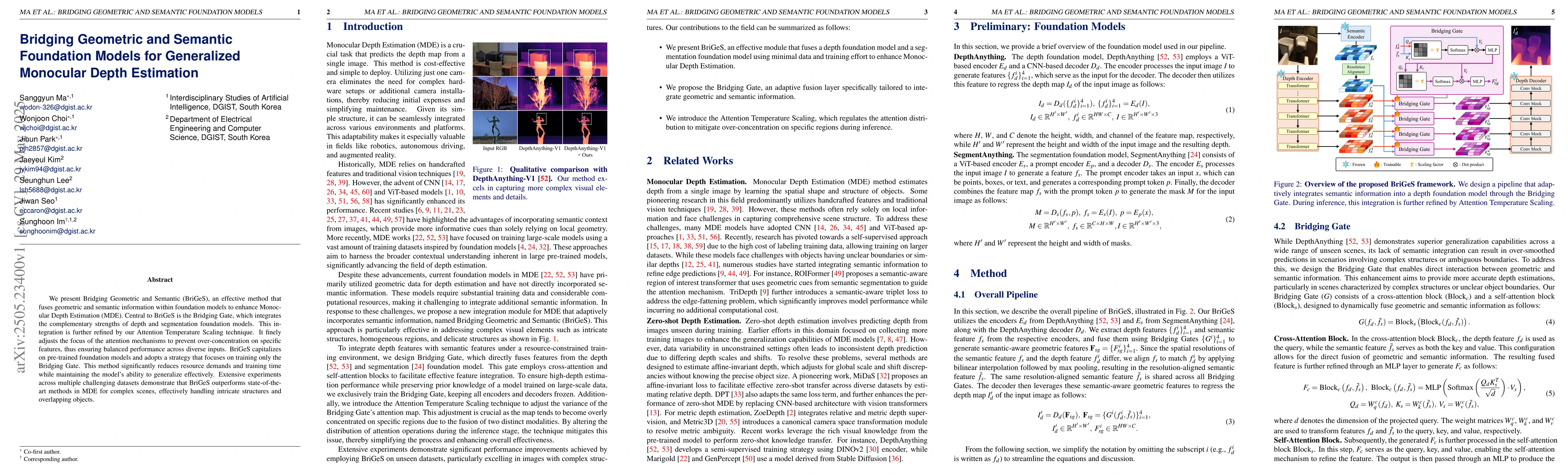 The research introduces Bridging Geometric and Semantic (BriGeS), a method that fuses geometric and semantic information within foundation models for Monocular Depth Estimation (MDE). BriGeS utilizes a Bridging Gate and Attention Temperature Scaling technique to integrate depth and segmentation foundation models effectively.