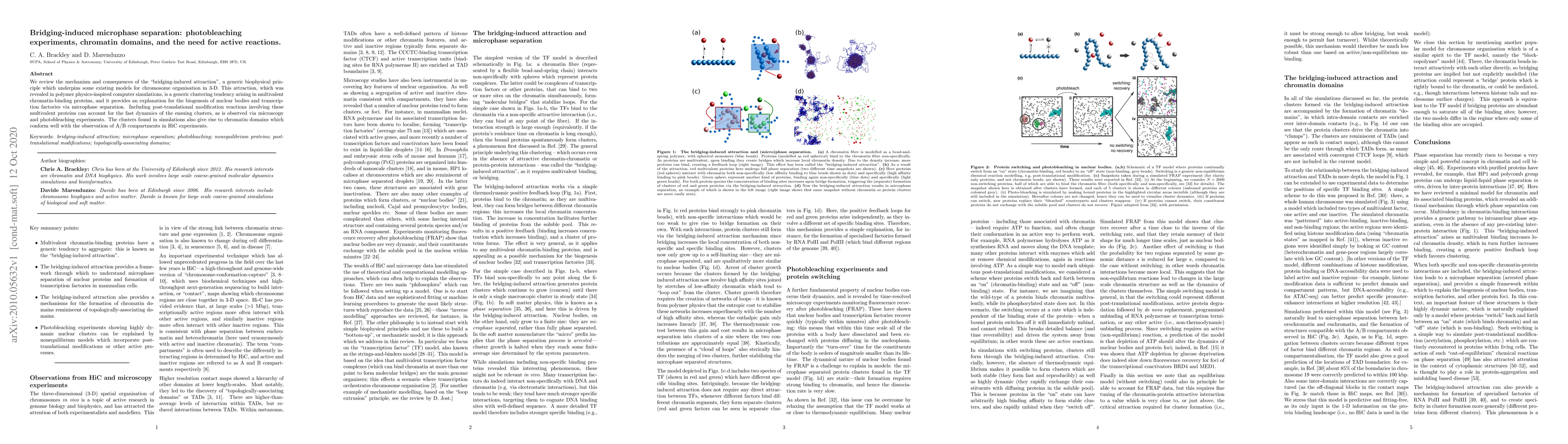We review the mechanism and consequences of the "bridging-induced attraction", a generic biophysical principle which underpins some existing models for chromosome organisation in 3-D. This attraction, which was revealed in polymer physics-inspired computer simulations, is a generic clustering tendency arising in multivalent chromatin-binding proteins, and it provides an explanation for the biogenesis of nuclear bodies and transcription factories via microphase separation. Including post-translational modification reactions involving these multivalent proteins can account for the fast dynamics of the ensuing clusters, as is observed via microscopy and photobleaching experiments. The clusters found in simulations also give rise to chromatin domains which conform well with the observation of A/B compartments in HiC experiments.