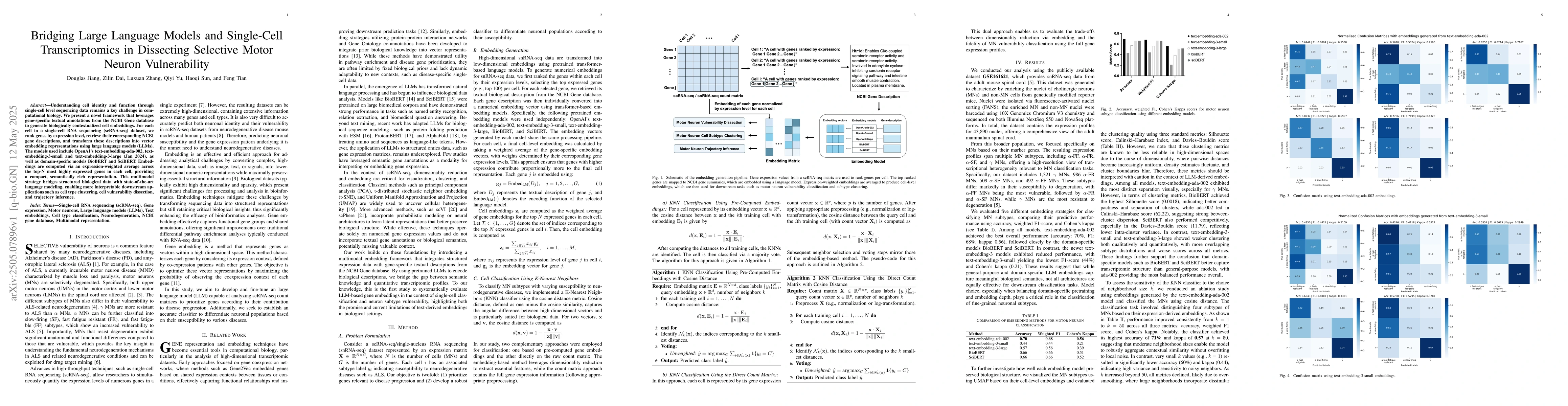 The research presents a novel framework that integrates single-cell RNA sequencing (scRNA-seq) data with gene-specific textual annotations from NCBI Gene, leveraging large language models (LLMs) like OpenAI's text-embedding models and domain-specific models BioBERT, SciBERT to generate biologically contextualized cell embeddings. These embeddings are created by ranking genes by expression level, retrieving descriptions, and transforming them into vector representations, followed by an expression-weighted average of top N genes.