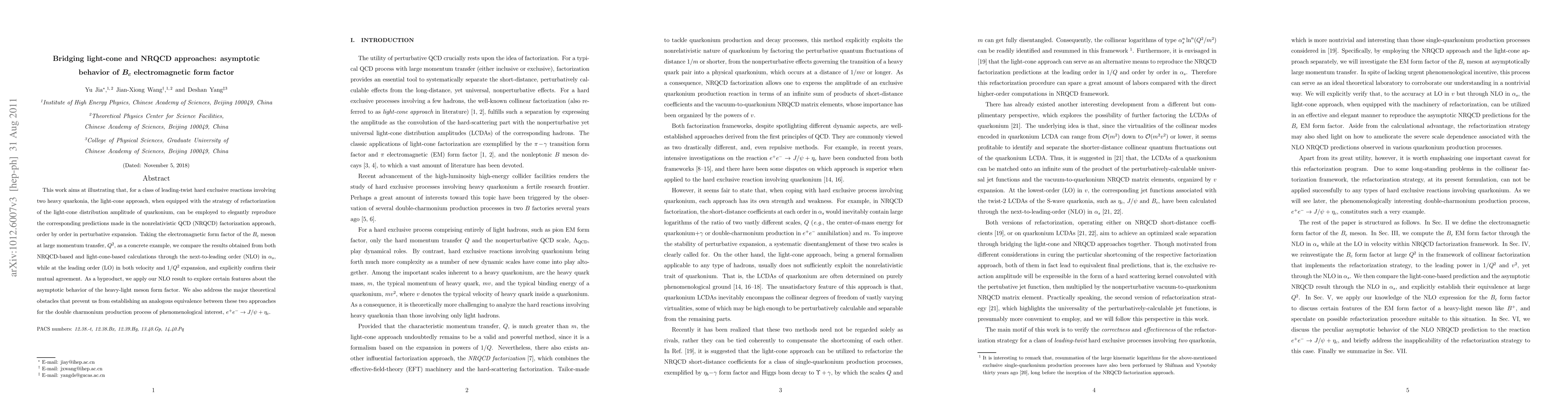 This research demonstrates that the light-cone approach, refactorized with the distribution amplitude of quarkonium, can reproduce NRQCD predictions for leading-twist hard exclusive reactions involving heavy quarkonia, exemplified by the electromagnetic form factor of $B_c$ meson at large momentum transfer. Both approaches agree at next-to-leading order in $\alpha_s$ and leading order in velocity and $1/Q^2$ expansion.