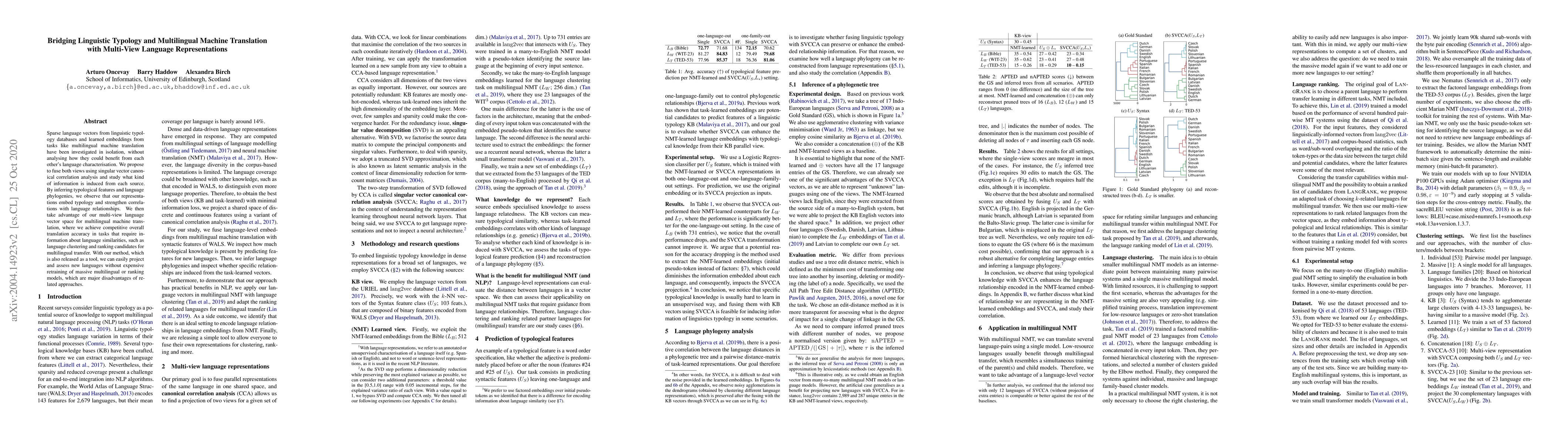 Sparse language vectors from linguistic typology databases and learned embeddings from tasks like multilingual machine translation have been investigated in isolation, without analysing how they could benefit from each other's language characterisation. We propose to fuse both views using singular vector canonical correlation analysis and study what kind of information is induced from each source. By inferring typological features and language phylogenies, we observe that our representations embed typology and strengthen correlations with language relationships. We then take advantage of our multi-view language vector space for multilingual machine translation, where we achieve competitive overall translation accuracy in tasks that require information about language similarities, such as language clustering and ranking candidates for multilingual transfer. With our method, which is also released as a tool, we can easily project and assess new languages without expensive retraining of massive multilingual or ranking models, which are major disadvantages of related approaches.