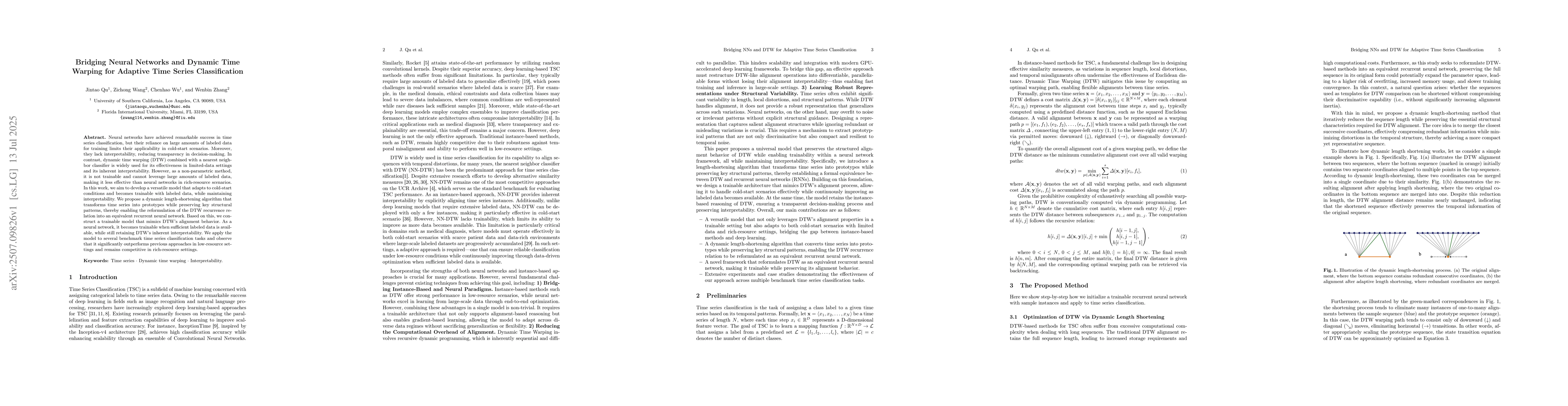 Neural networks have achieved remarkable success in time series classification, but their reliance on large amounts of labeled data for training limits their applicability in cold-start scenarios. Moreover, they lack interpretability, reducing transparency in decision-making. In contrast, dynamic time warping (DTW) combined with a nearest neighbor classifier is widely used for its effectiveness in limited-data settings and its inherent interpretability. However, as a non-parametric method, it is not trainable and cannot leverage large amounts of labeled data, making it less effective than neural networks in rich-resource scenarios. In this work, we aim to develop a versatile model that adapts to cold-start conditions and becomes trainable with labeled data, while maintaining interpretability. We propose a dynamic length-shortening algorithm that transforms time series into prototypes while preserving key structural patterns, thereby enabling the reformulation of the DTW recurrence relation into an equivalent recurrent neural network. Based on this, we construct a trainable model that mimics DTW's alignment behavior. As a neural network, it becomes trainable when sufficient labeled data is available, while still retaining DTW's inherent interpretability. We apply the model to several benchmark time series classification tasks and observe that it significantly outperforms previous approaches in low-resource settings and remains competitive in rich-resource settings.