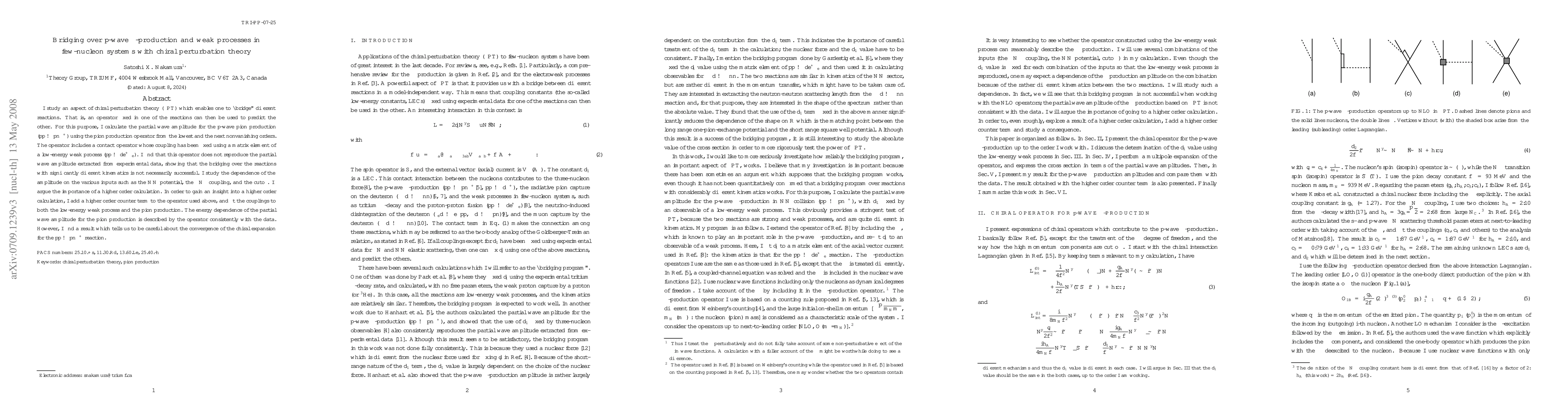 I study an aspect of chiral perturbation theory (\chi PT) which enables one to ``bridge'' different reactions. That is, an operator fixed in one of the reactions can then be used to predict the other. For this purpose, I calculate the partial wave amplitude for the p-wave pion production (pp\to pn\pi^+) using the pion production operator from the lowest and the next nonvanishing orders. The operator includes a contact operator whose coupling has been fixed using a matrix element of a low-energy weak process (pp\to de^+\nu_e). I find that this operator does not reproduce the partial wave amplitude extracted from experimental data, showing that the bridging over the reactions with significantly different kinematics is not necessarily successful. I study the dependence of the amplitude on the various inputs such as the NN potential, the \pi N\Delta coupling, and the cutoff. I argue the importance of a higher order calculation. In order to gain an insight into a higher order calculation, I add a higher order counter term to the operator used above, and fit the couplings to both the low-energy weak process and the pion production. The energy dependence of the partial wave amplitude for the pion production is described by the operator consistently with the data. However, I find a result which tells us to be careful about the convergence of the chiral expansion for the pp\to pn\pi^+ reaction.