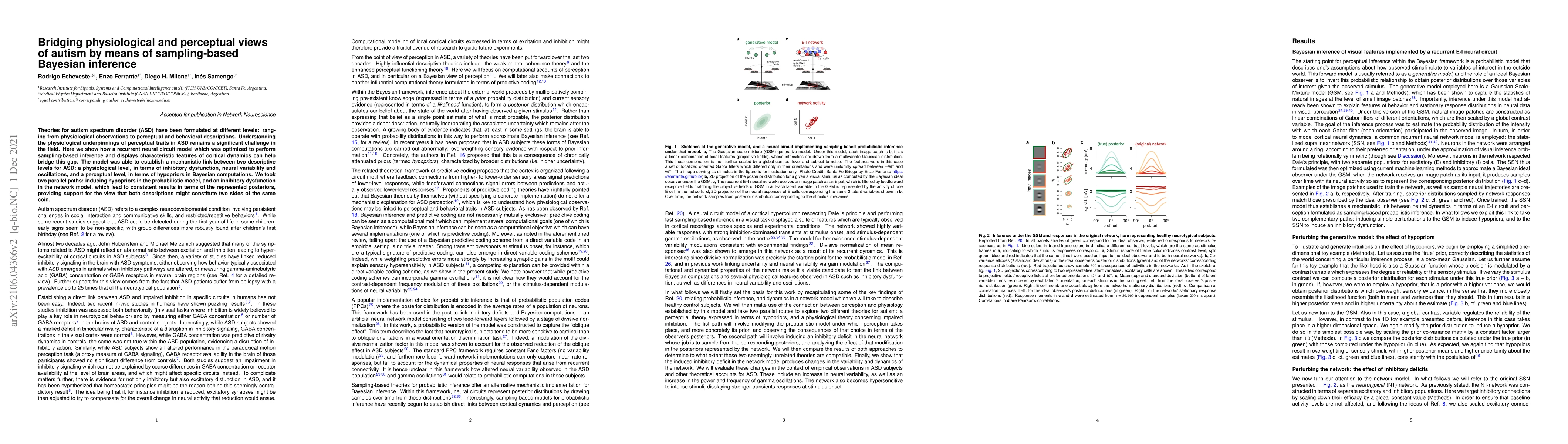 This paper uses a recurrent neural circuit model to bridge physiological and perceptual views of autism, showing that inhibitory dysfunction and neural variability can mechanistically link the physiological level to perceptual traits like hypopriors in Bayesian computations. The model's results support the idea that these two levels of ASD description are interconnected.