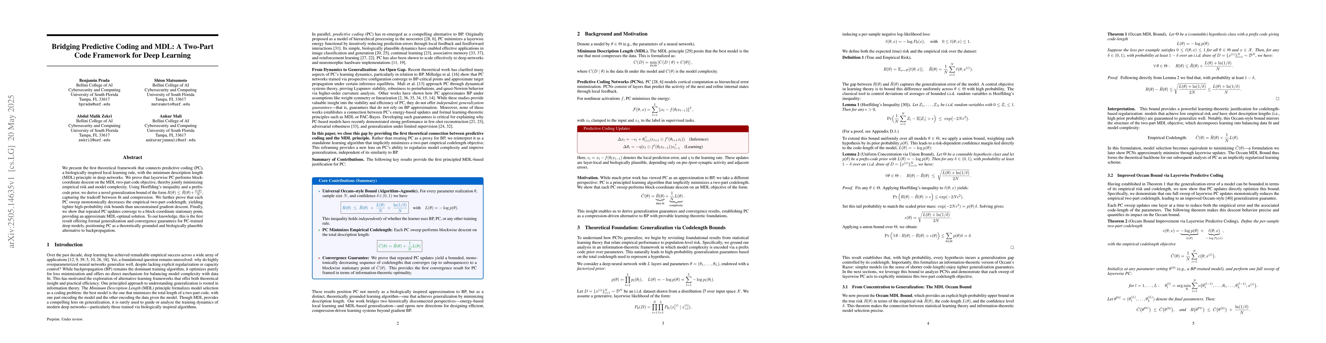 The research presents a theoretical framework connecting predictive coding (PC) with the minimum description length (MDL) principle in deep networks, proving that layerwise PC performs block-coordinate descent on the MDL two-part code objective, and deriving a novel generalization bound.