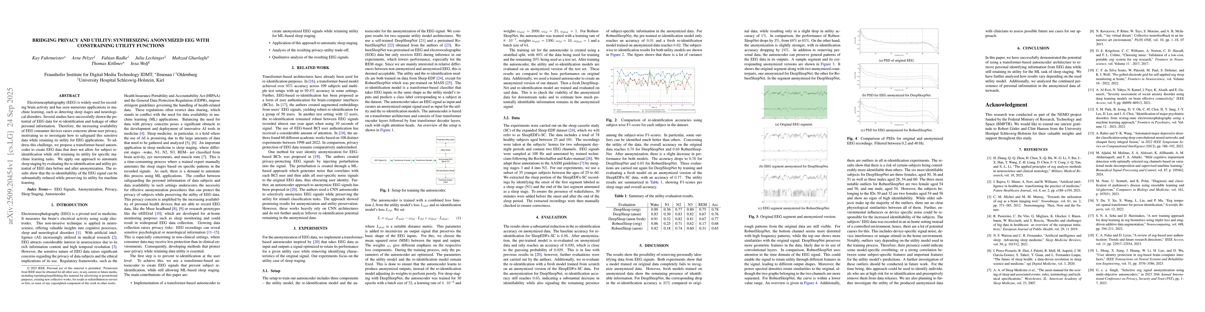 Electroencephalography (EEG) is widely used for recording brain activity and has seen numerous applications in machine learning, such as detecting sleep stages and neurological disorders. Several studies have successfully shown the potential of EEG data for re-identification and leakage of other personal information. Therefore, the increasing availability of EEG consumer devices raises concerns about user privacy, motivating us to investigate how to safeguard this sensitive data while retaining its utility for EEG applications. To address this challenge, we propose a transformer-based autoencoder to create EEG data that does not allow for subject re-identification while still retaining its utility for specific machine learning tasks. We apply our approach to automatic sleep staging by evaluating the re-identification and utility potential of EEG data before and after anonymization. The results show that the re-identifiability of the EEG signal can be substantially reduced while preserving its utility for machine learning.