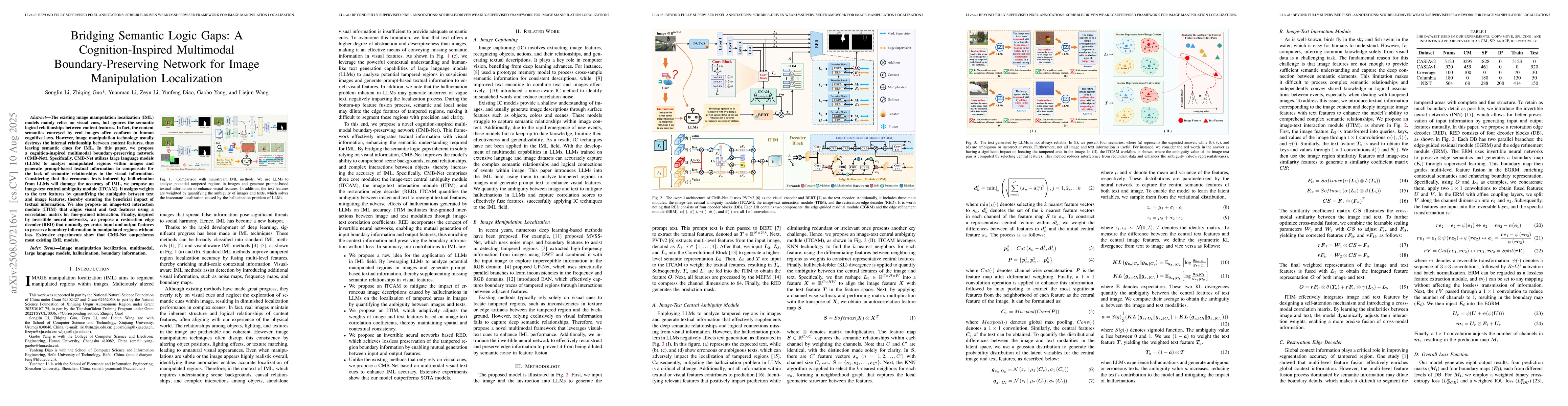 The existing image manipulation localization (IML) models mainly relies on visual cues, but ignores the semantic logical relationships between content features. In fact, the content semantics conveyed by real images often conform to human cognitive laws. However, image manipulation technology usually destroys the internal relationship between content features, thus leaving semantic clues for IML. In this paper, we propose a cognition-inspired multimodal boundary-preserving network (CMB-Net). Specifically, CMB-Net utilizes large language models (LLMs) to analyze manipulated regions within images and generate prompt-based textual information to compensate for the lack of semantic relationships in the visual information. Considering that the erroneous texts induced by hallucination from LLMs will damage the accuracy of IML, we propose an image-text central ambiguity module (ITCAM). It assigns weights to the text features by quantifying the ambiguity between text and image features, thereby ensuring the beneficial impact of textual information. We also propose an image-text interaction module (ITIM) that aligns visual and text features using a correlation matrix for fine-grained interaction. Finally, inspired by invertible neural networks, we propose a restoration edge decoder (RED) that mutually generates input and output features to preserve boundary information in manipulated regions without loss. Extensive experiments show that CMB-Net outperforms most existing IML models.