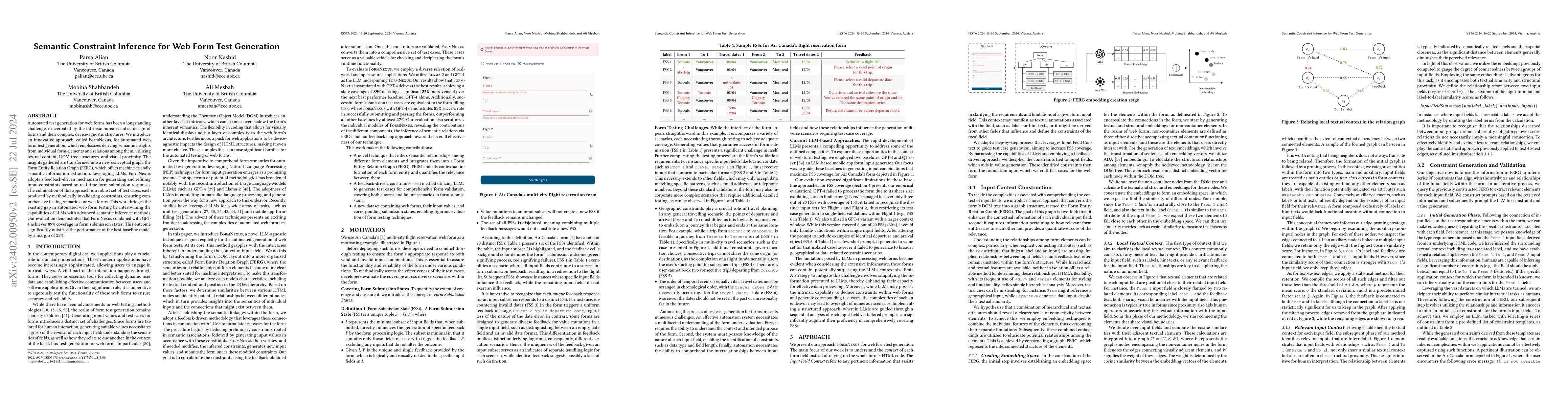 Automated test generation for web forms has been a longstanding challenge, exacerbated by the intrinsic human-centric design of forms and their complex, device-agnostic structures. We introduce an innovative approach, called FormNexus, for automated web form test generation, which emphasizes deriving semantic insights from individual form elements and relations among them, utilizing textual content, DOM tree structures, and visual proximity. The insights gathered are transformed into a new conceptual graph, the Form Entity Relation Graph (FERG), which offers machine-friendly semantic information extraction. Leveraging LLMs, FormNexus adopts a feedback-driven mechanism for generating and refining input constraints based on real-time form submission responses. The culmination of this approach is a robust set of test cases, each produced by methodically invalidating constraints, ensuring comprehensive testing scenarios for web forms. This work bridges the existing gap in automated web form testing by intertwining the capabilities of LLMs with advanced semantic inference methods. Our evaluation demonstrates that FormNexus combined with GPT-4 achieves 89% coverage in form submission states. This outcome significantly outstrips the performance of the best baseline model by a margin of 25%.