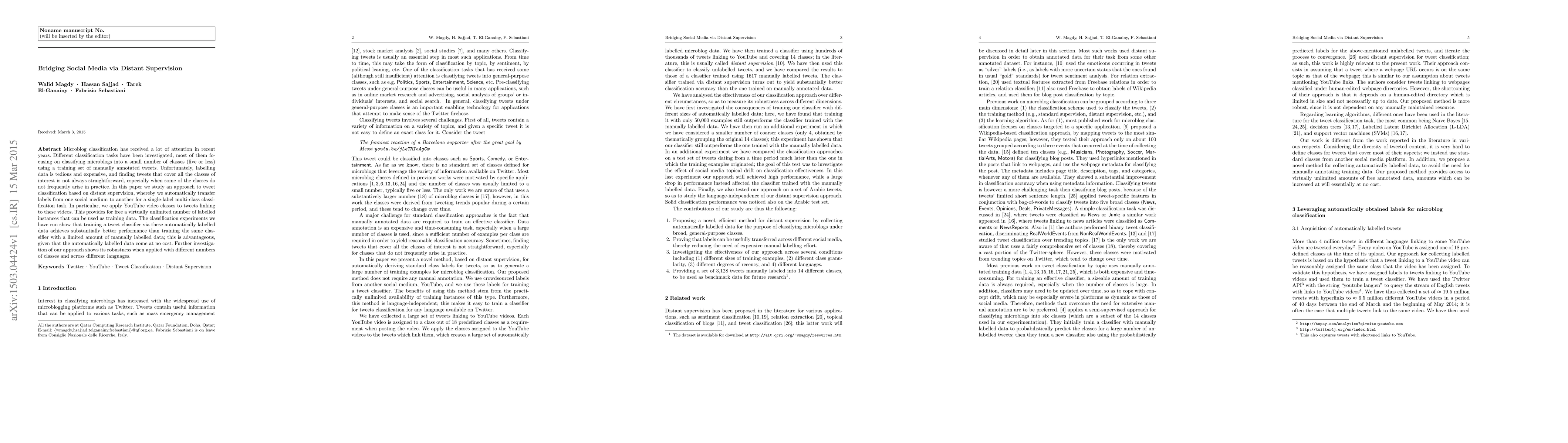 Microblog classification has received a lot of attention in recent years. Different classification tasks have been investigated, most of them focusing on classifying microblogs into a small number of classes (five or less) using a training set of manually annotated tweets. Unfortunately, labelling data is tedious and expensive, and finding tweets that cover all the classes of interest is not always straightforward, especially when some of the classes do not frequently arise in practice. In this paper we study an approach to tweet classification based on distant supervision, whereby we automatically transfer labels from one social medium to another for a single-label multi-class classification task. In particular, we apply YouTube video classes to tweets linking to these videos. This provides for free a virtually unlimited number of labelled instances that can be used as training data. The classification experiments we have run show that training a tweet classifier via these automatically labelled data achieves substantially better performance than training the same classifier with a limited amount of manually labelled data; this is advantageous, given that the automatically labelled data come at no cost. Further investigation of our approach shows its robustness when applied with different numbers of classes and across different languages.