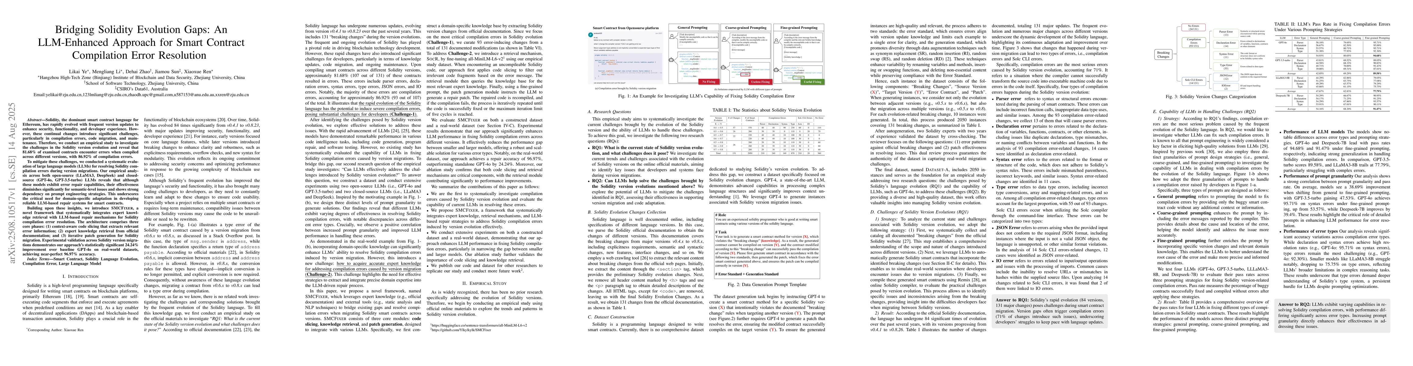 Solidity, the dominant smart contract language for Ethereum, has rapidly evolved with frequent version updates to enhance security, functionality, and developer experience. However, these continual changes introduce significant challenges, particularly in compilation errors, code migration, and maintenance. Therefore, we conduct an empirical study to investigate the challenges in the Solidity version evolution and reveal that 81.68% of examined contracts encounter errors when compiled across different versions, with 86.92% of compilation errors. To mitigate these challenges, we conducted a systematic evaluation of large language models (LLMs) for resolving Solidity compilation errors during version migrations. Our empirical analysis across both open-source (LLaMA3, DeepSeek) and closed-source (GPT-4o, GPT-3.5-turbo) LLMs reveals that although these models exhibit error repair capabilities, their effectiveness diminishes significantly for semantic-level issues and shows strong dependency on prompt engineering strategies. This underscores the critical need for domain-specific adaptation in developing reliable LLM-based repair systems for smart contracts. Building upon these insights, we introduce SMCFIXER, a novel framework that systematically integrates expert knowledge retrieval with LLM-based repair mechanisms for Solidity compilation error resolution. The architecture comprises three core phases: (1) context-aware code slicing that extracts relevant error information; (2) expert knowledge retrieval from official documentation; and (3) iterative patch generation for Solidity migration. Experimental validation across Solidity version migrations demonstrates our approach's statistically significant 24.24% improvement over baseline GPT-4o on real-world datasets, achieving near-perfect 96.97% accuracy.
