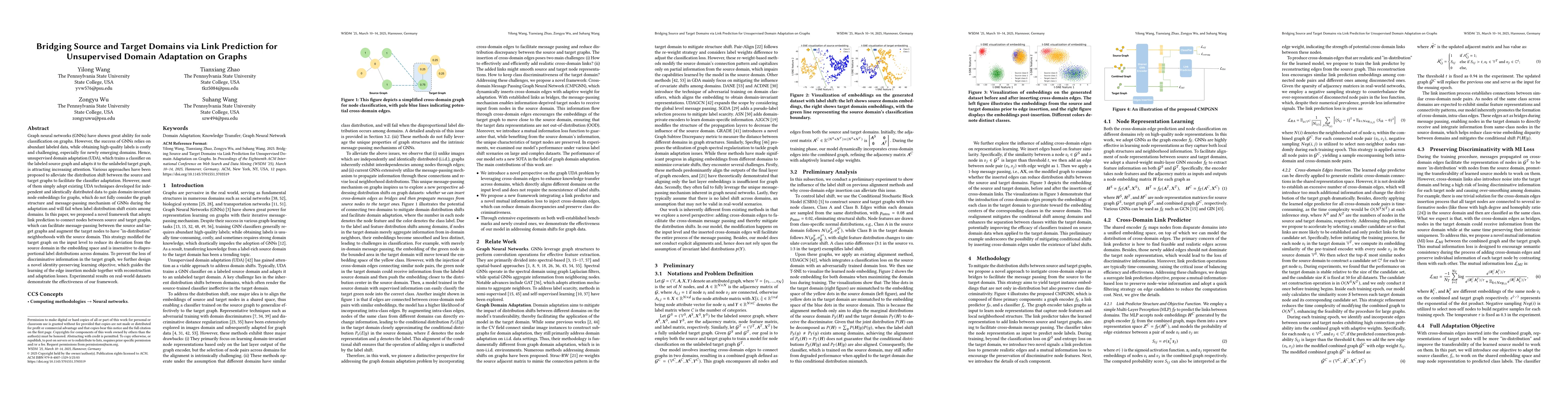 A new framework for unsupervised domain adaptation on graphs uses link prediction to bridge source and target domains, improving node classification accuracy without requiring labeled data.
