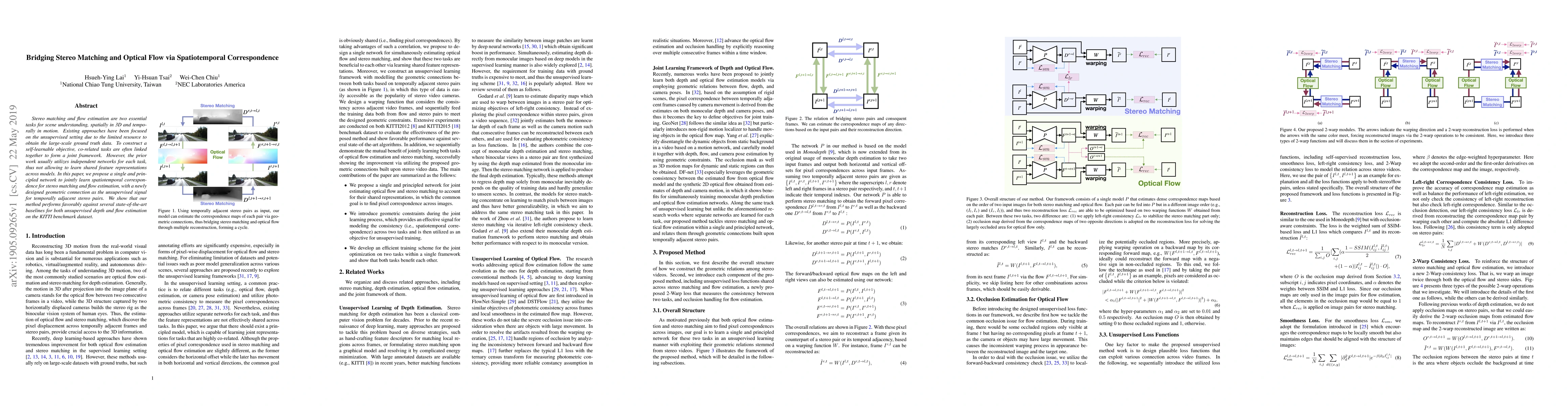 This paper proposes a unified network to jointly learn stereo matching and optical flow estimation, leveraging spatiotemporal correspondence and an unsupervised geometric connection for training. The method outperforms existing state-of-the-art approaches for unsupervised depth and flow estimation on the KITTI dataset.