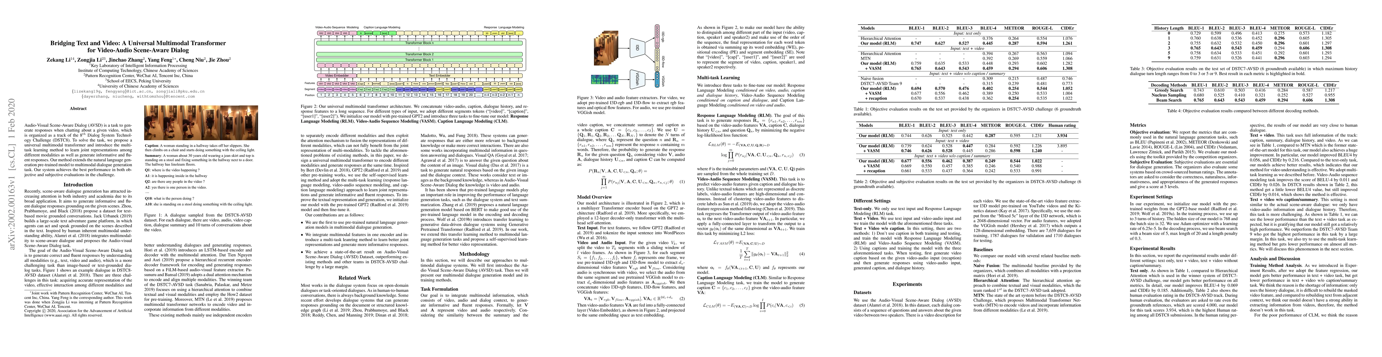 This paper proposes a universal multimodal transformer for generating audio-visual scene-aware dialog responses in videos, leveraging multi-task learning to enhance joint representation across modalities. The method achieves top performance in both objective and subjective evaluations in the DSTC8 challenge.
