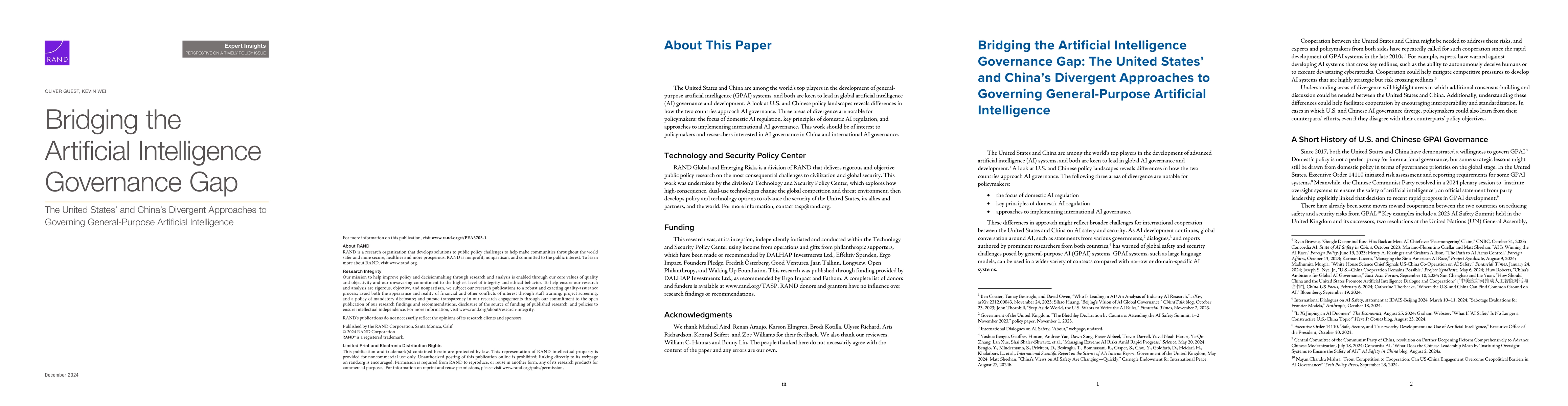 The United States and China are among the world's top players in the development of advanced artificial intelligence (AI) systems, and both are keen to lead in global AI governance and development. A look at U.S. and Chinese policy landscapes reveals differences in how the two countries approach the governance of general-purpose artificial intelligence (GPAI) systems. Three areas of divergence are notable for policymakers: the focus of domestic AI regulation, key principles of domestic AI regulation, and approaches to implementing international AI governance. As AI development continues, global conversation around AI has warned of global safety and security challenges posed by GPAI systems. Cooperation between the United States and China might be needed to address these risks, and understanding the implications of these differences might help address the broader challenges for international cooperation between the United States and China on AI safety and security.