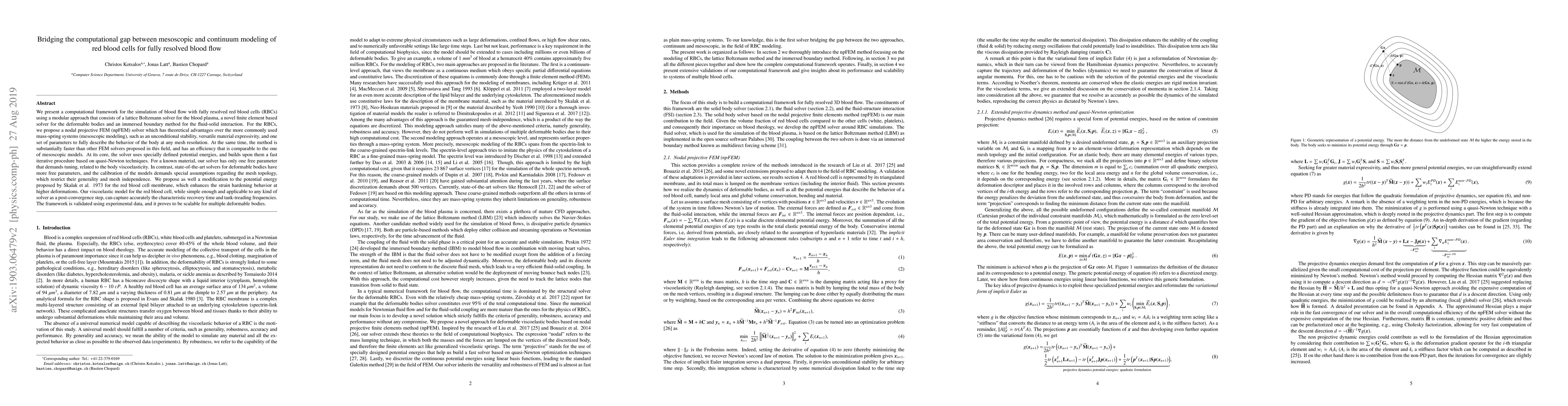 We present a computational framework for the simulation of blood flow with fully resolved red blood cells (RBCs) using a modular approach that consists of a lattice Boltzmann solver for the blood plasma, a novel finite element based solver for the deformable bodies and an immersed boundary method for the fluid-solid interaction. For the RBCs, we propose a nodal projective FEM (npFEM) solver which has theoretical advantages over the more commonly used mass-spring systems (mesoscopic modeling), such as an unconditional stability, versatile material expressivity, and one set of parameters to fully describe the behavior of the body at any mesh resolution. At the same time, the method is substantially faster than other FEM solvers proposed in this field, and has an efficiency that is comparable to the one of mesoscopic models. At its core, the solver uses specially defined potential energies, and builds upon them a fast iterative procedure based on quasi-Newton techniques. For a known material, our solver has only one free parameter that demands tuning, related to the body viscoelasticity. In contrast, state-of-the-art solvers for deformable bodies have more free parameters, and the calibration of the models demands special assumptions regarding the mesh topology, which restrict their generality and mesh independence. We propose as well a modification to the potential energy proposed by Skalak et al. 1973 for the red blood cell membrane, which enhances the strain hardening behavior at higher deformations. Our viscoelastic model for the red blood cell, while simple enough and applicable to any kind of solver as a post-convergence step, can capture accurately the characteristic recovery time and tank-treading frequencies. The framework is validated using experimental data, and it proves to be scalable for multiple deformable bodies.