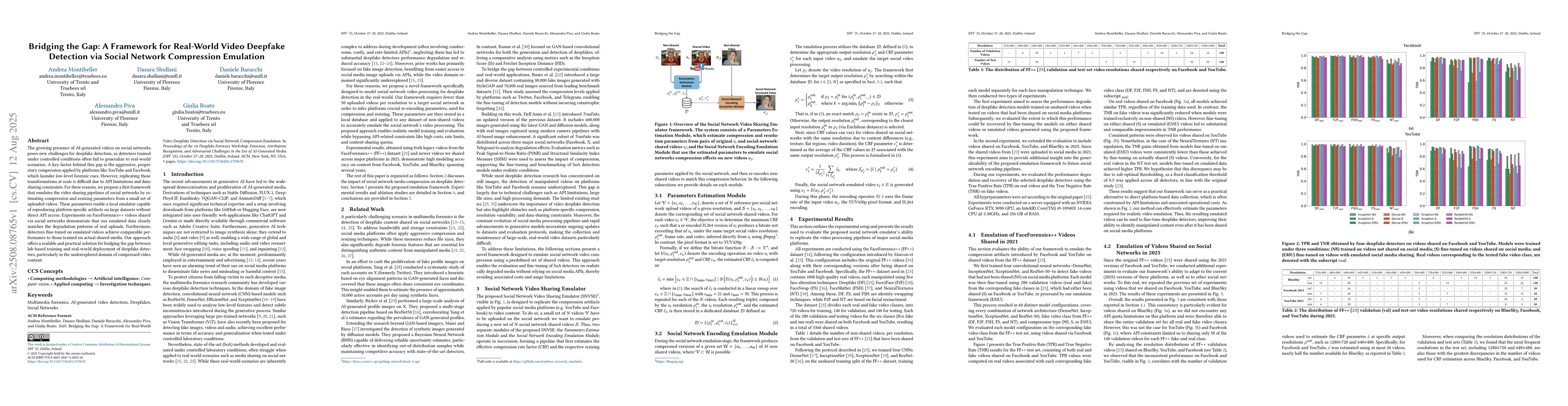 This research introduces a framework to bridge the gap between lab-based deepfake detection and real-world social media scenarios. It proposes emulating video compression and resizing parameters from limited social network uploads to generate platform-specific artifacts on large datasets, without direct API access. The method is validated with FaceForensics++ videos, showing emulated data closely matches real upload degradation, and detectors fine-tuned on this data perform comparably to those trained on actual shared media.