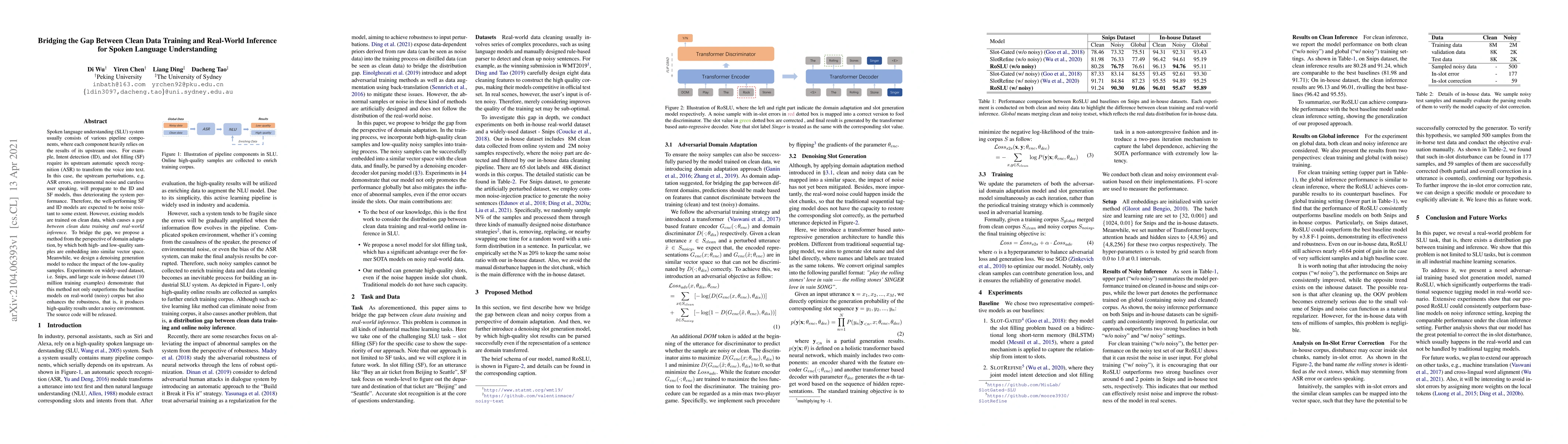 This paper proposes a domain adaptation method to bridge the gap between clean data training and real-world inference for spoken language understanding systems, aiming to enhance robustness against noise and errors. The method embeds high- and low-quality samples into a similar vector space and employs a denoising generation model, demonstrating improved performance on noisy datasets.