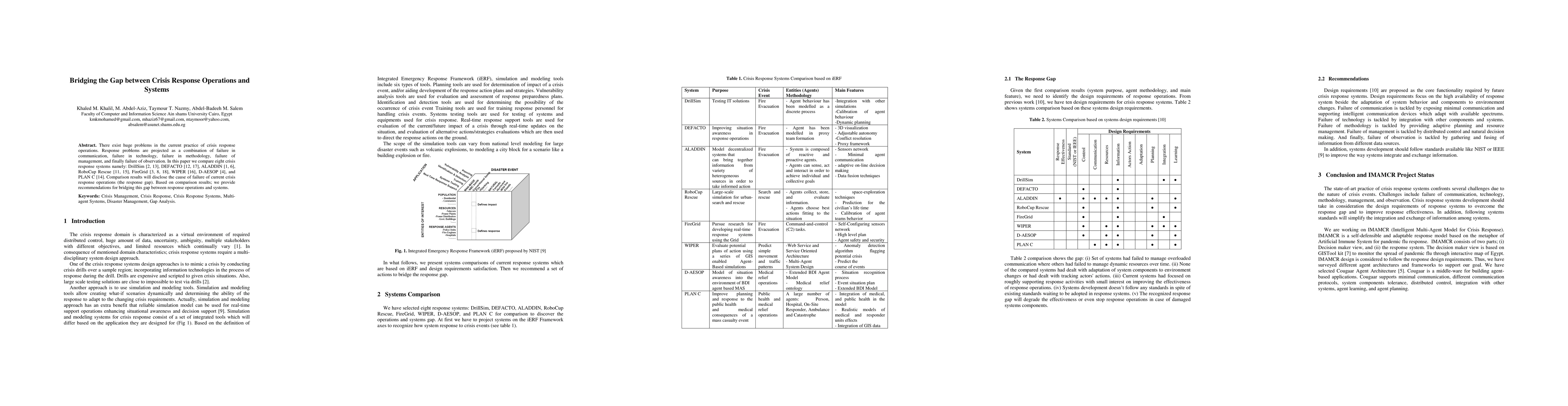 There exist huge problems in the current practice of crisis response operations. Response problems are projected as a combination of failure in communication, failure in technology, failure in methodology, failure of management, and finally failure of observation. In this paper we compare eight crisis response systems namely: DrillSim [2, 13], DEFACTO [12, 17], ALADDIN [1, 6], RoboCup Rescue [11, 15], FireGrid [3, 8, 18], WIPER [16], D-AESOP [4], and PLAN C [14]. Comparison results will disclose the cause of failure of current crisis response operations (the response gap). Based on comparison results; we provide recommendations for bridging this gap between response operations and systems.