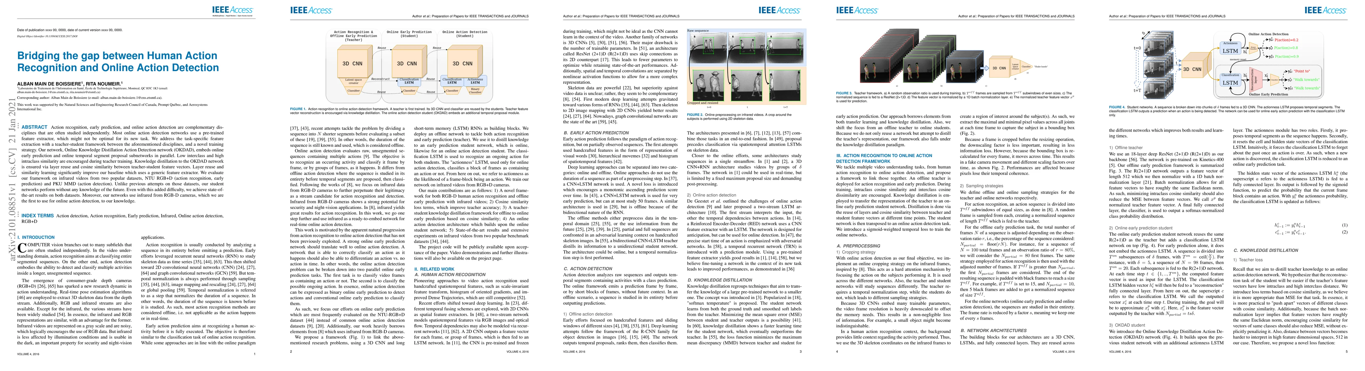 Action recognition, early prediction, and online action detection are complementary disciplines that are often studied independently. Most online action detection networks use a pre-trained feature extractor, which might not be optimal for its new task. We address the task-specific feature extraction with a teacher-student framework between the aforementioned disciplines, and a novel training strategy. Our network, Online Knowledge Distillation Action Detection network (OKDAD), embeds online early prediction and online temporal segment proposal subnetworks in parallel. Low interclass and high intraclass similarity are encouraged during teacher training. Knowledge distillation to the OKDAD network is ensured via layer reuse and cosine similarity between teacher-student feature vectors. Layer reuse and similarity learning significantly improve our baseline which uses a generic feature extractor. We evaluate our framework on infrared videos from two popular datasets, NTU RGB+D (action recognition, early prediction) and PKU MMD (action detection). Unlike previous attempts on those datasets, our student networks perform without any knowledge of the future. Even with this added difficulty, we achieve state-of-the-art results on both datasets. Moreover, our networks use infrared from RGB-D cameras, which we are the first to use for online action detection, to our knowledge.