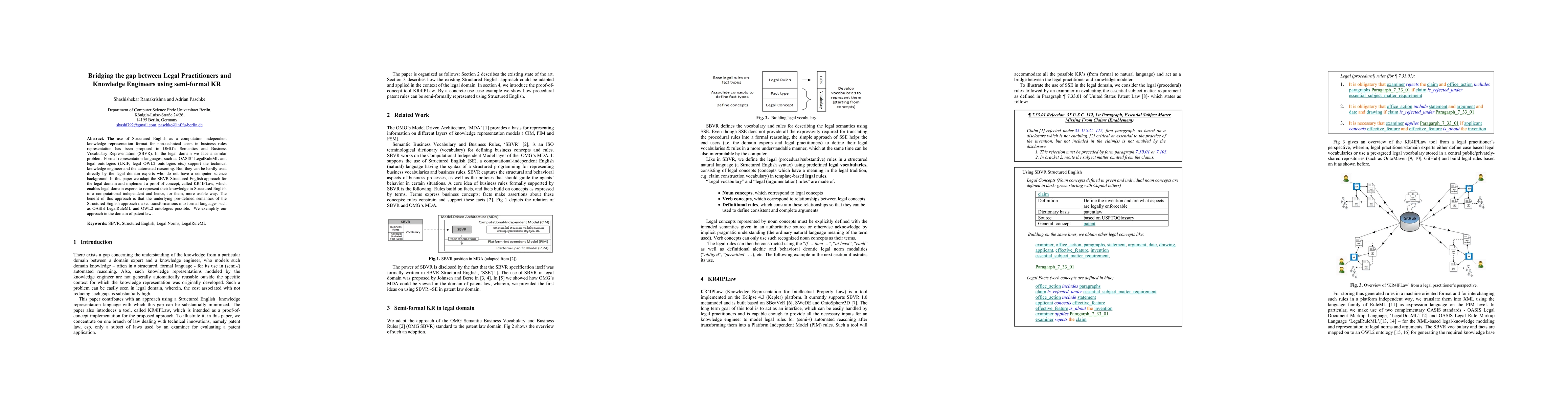 The use of Structured English as a computation independent knowledge representation format for non-technical users in business rules representation has been proposed in OMGs Semantics and Business Vocabulary Representation (SBVR). In the legal domain we face a similar problem. Formal representation languages, such as OASIS LegalRuleML and legal ontologies (LKIF, legal OWL2 ontologies etc.) support the technical knowledge engineer and the automated reasoning. But, they can be hardly used directly by the legal domain experts who do not have a computer science background. In this paper we adapt the SBVR Structured English approach for the legal domain and implement a proof-of-concept, called KR4IPLaw, which enables legal domain experts to represent their knowledge in Structured English in a computational independent and hence, for them, more usable way. The benefit of this approach is that the underlying pre-defined semantics of the Structured English approach makes transformations into formal languages such as OASIS LegalRuleML and OWL2 ontologies possible. We exemplify our approach in the domain of patent law.
