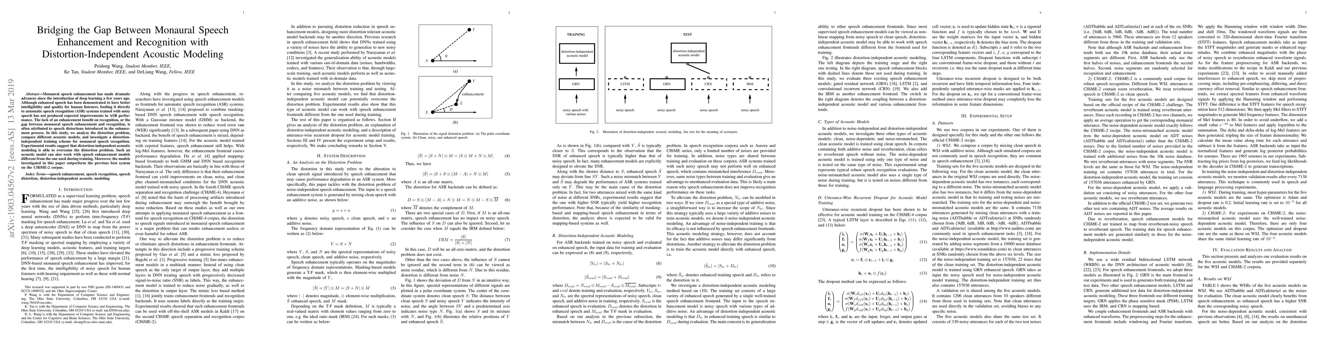 This paper investigates the gap between monaural speech enhancement and recognition, proposing a distortion-independent acoustic modeling approach to improve automatic speech recognition performance. Experimental results show that this method effectively mitigates distortions introduced by enhancement, outperforming previous models on the CHiME-2 corpus.
