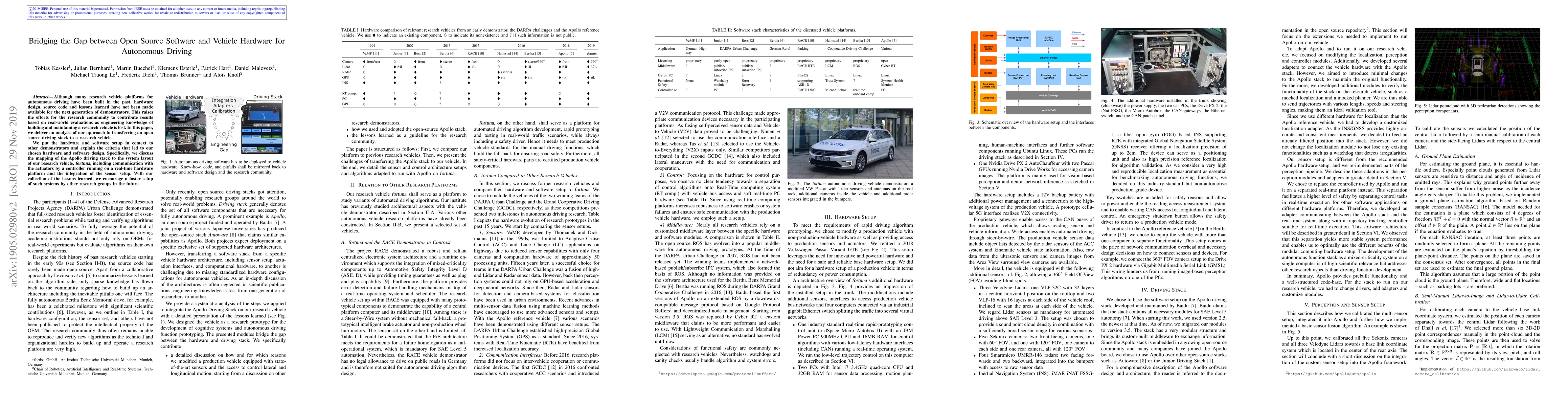 Although many research vehicle platforms for autonomous driving have been built in the past, hardware design, source code and lessons learned have not been made available for the next generation of demonstrators. This raises the efforts for the research community to contribute results based on real-world evaluations as engineering knowledge of building and maintaining a research vehicle is lost. In this paper, we deliver an analysis of our approach to transferring an open source driving stack to a research vehicle. We put the hardware and software setup in context to other demonstrators and explain the criteria that led to our chosen hardware and software design. Specifically, we discuss the mapping of the Apollo driving stack to the system layout of our research vehicle, fortuna, including communication with the actuators by a controller running on a real-time hardware platform and the integration of the sensor setup. With our collection of the lessons learned, we encourage a faster setup of such systems by other research groups in the future.