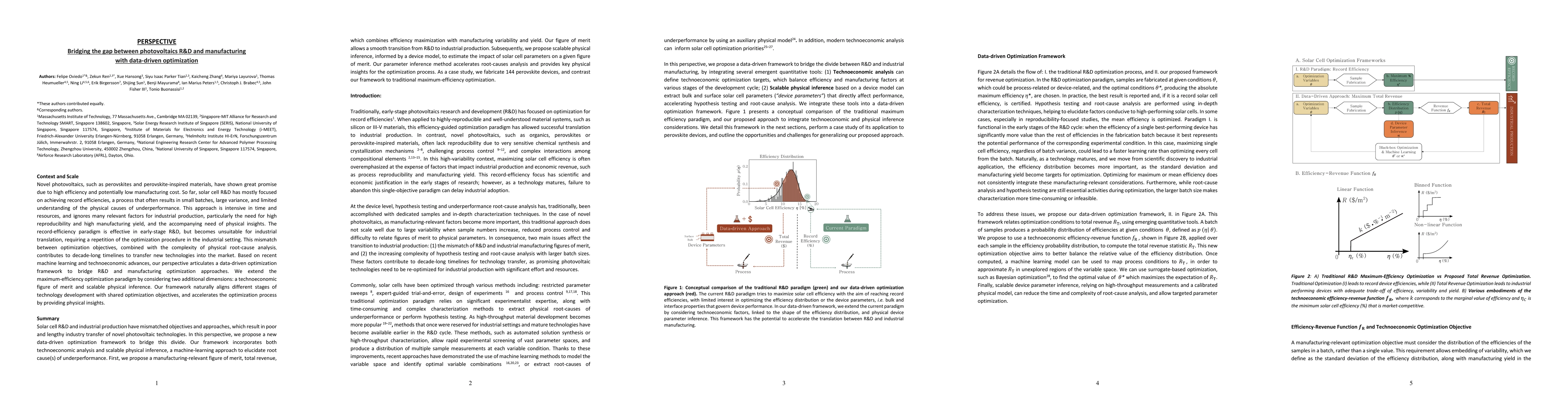 This paper proposes a data-driven optimization framework to bridge photovoltaic R&D and manufacturing, addressing the mismatch between high-efficiency R&D and industrial production needs. It integrates technoeconomic metrics and scalable physical analysis to accelerate technology transfer and improve reproducibility and yield.