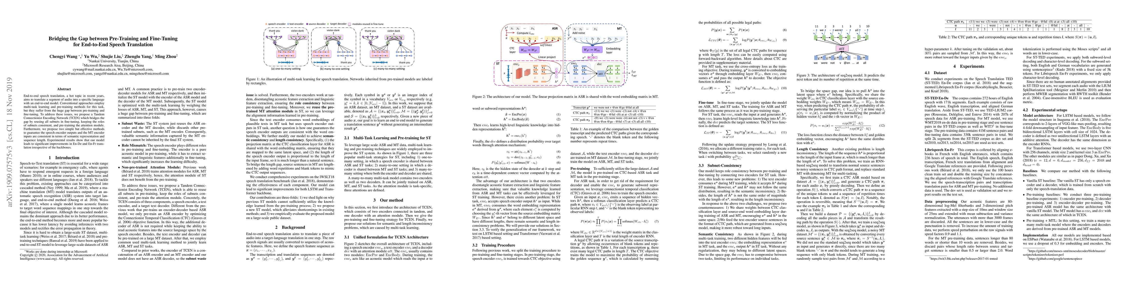 This paper proposes a Tandem Connectionist Encoding Network (TCEN) to bridge the gap between pre-training and fine-tuning in end-to-end speech translation, achieving better performance by reusing all subnets and pre-training the attention module. Experimental results show a 2.2 BLEU score improvement over baselines on a large dataset.