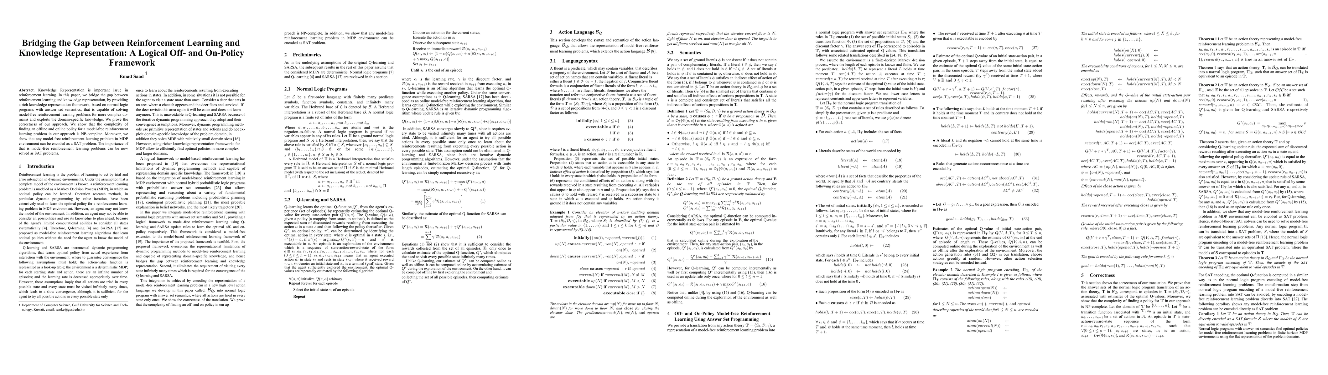 This paper introduces a logical framework based on normal logic programs with answer set semantics to bridge reinforcement learning and knowledge representation, enabling the solution of complex model-free reinforcement learning problems by leveraging domain-specific knowledge. The authors prove the framework's correctness and demonstrate its NP-complete complexity, showing that any model-free reinforcement learning problem can be encoded as a SAT problem.