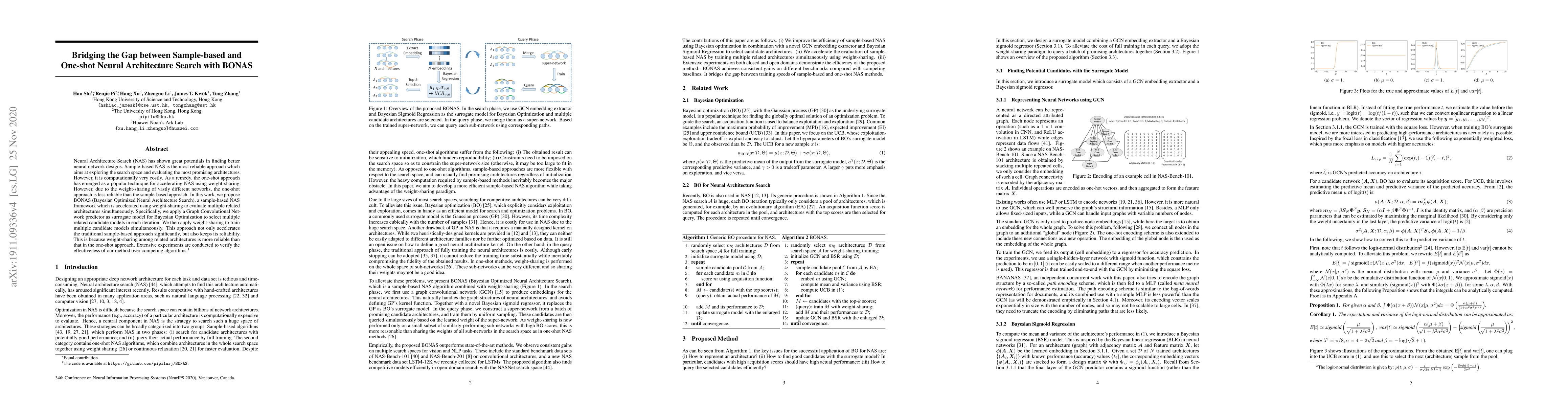 The paper proposes BONAS, a framework that accelerates sample-based Neural Architecture Search (NAS) using weight-sharing while maintaining reliability. It employs a Graph Convolutional Network predictor for Bayesian Optimization and weight-sharing among related architectures, achieving significant speedups without sacrificing accuracy compared to traditional methods.