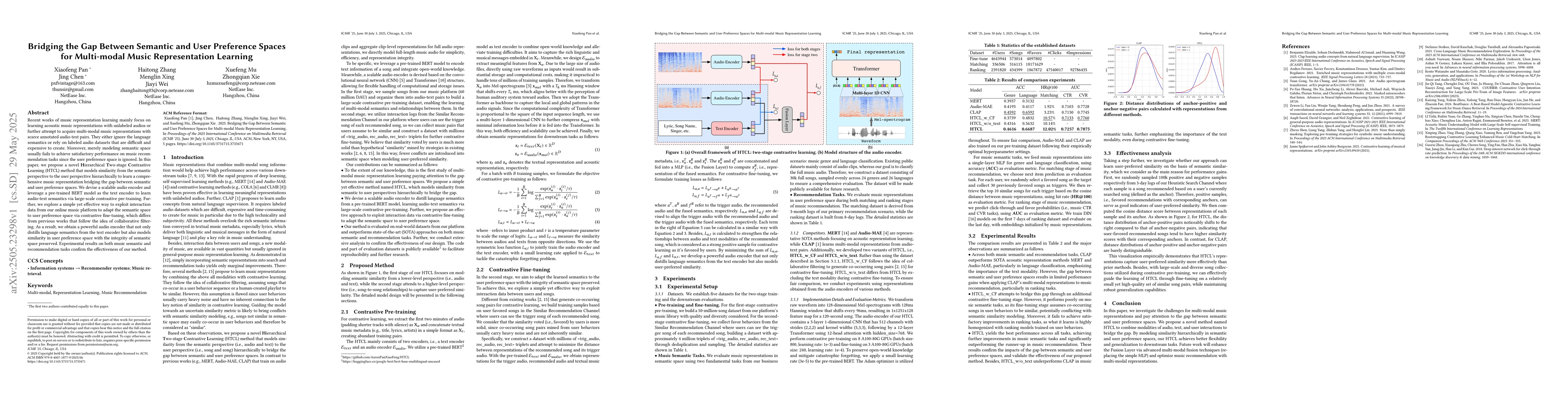 This work is novel as it is the first to focus on the gap between semantic and user preference spaces in multi-modal music representation learning, proposing a simple yet effective method (HTCL) to bridge this gap.