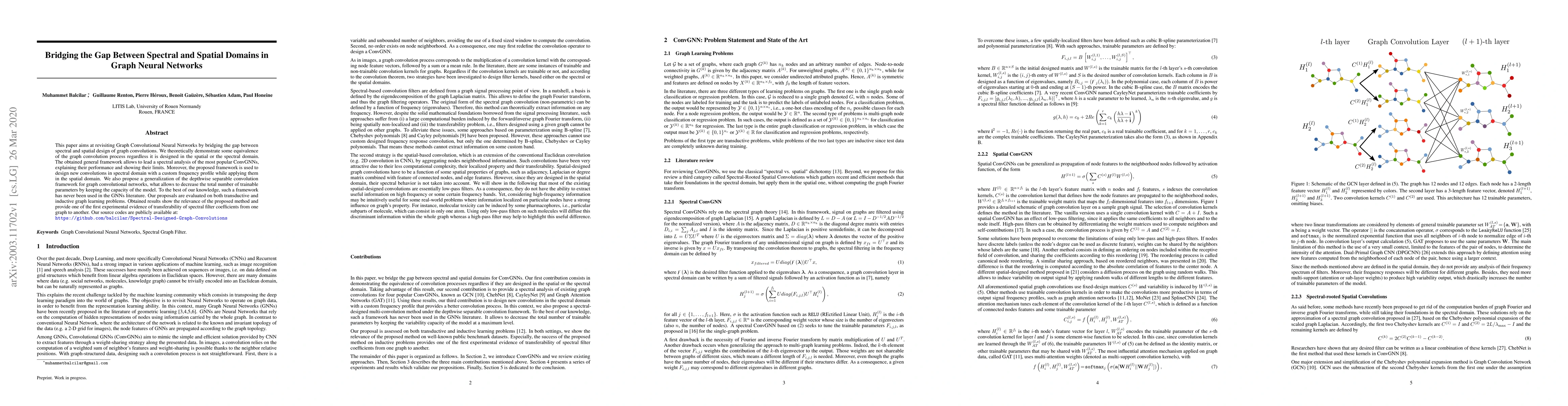 This paper bridges the spectral and spatial domains in Graph Convolutional Neural Networks (GCNNs) by demonstrating their equivalence and proposing a new framework for designing spectral convolutions. The authors introduce a generalization of depthwise separable convolutions to reduce parameters while maintaining model capacity, and evaluate their method on various graph learning tasks.