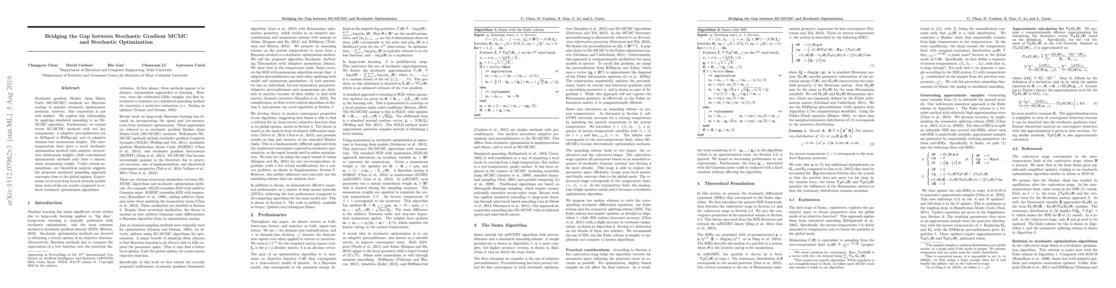 This paper bridges the gap between stochastic gradient MCMC and stochastic optimization by applying simulated annealing to an SG-MCMC algorithm, introducing adaptive preconditioners and element-wise momentum weights. Theoretical analysis and experiments on deep neural networks demonstrate its effectiveness and state-of-the-art performance.