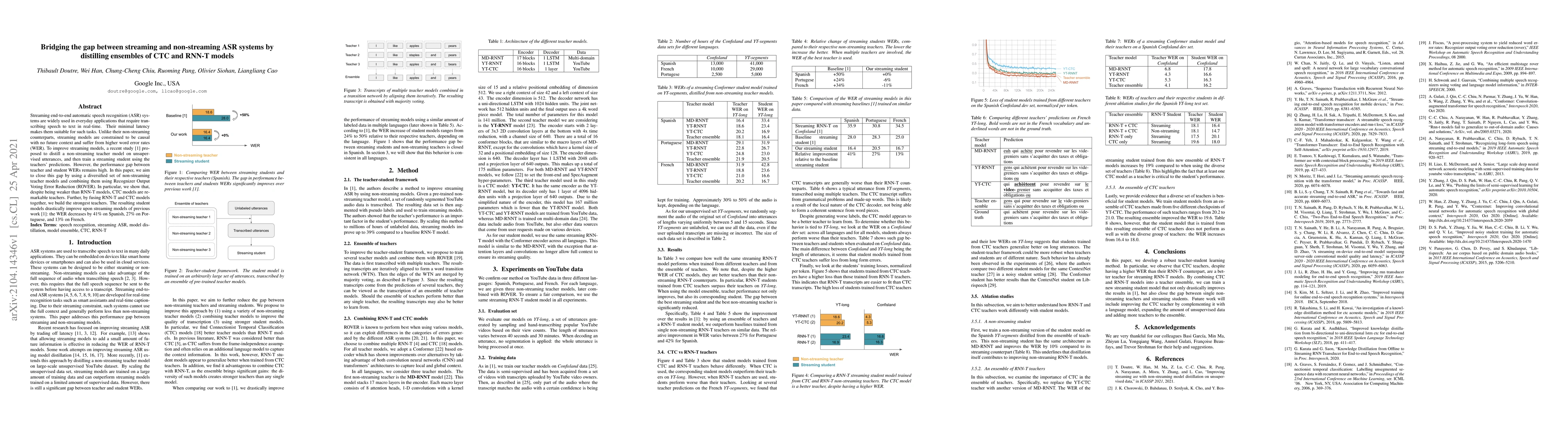 This paper proposes a method of distilling ensembles of Connectionist Temporal Classification (CTC) and Recurrent Neural Network Transducer (RNN-T) models to bridge the performance gap between streaming and non-streaming automatic speech recognition (ASR) systems. The study shows that fusing CTC and RNN-T models as teacher models, combined with Recognizer Output Voting Error Reduction (ROVER), significantly reduces word error rates in streaming student models, achieving a 41% reduction in Spanish, 27% in Portuguese, and 13% in French.
