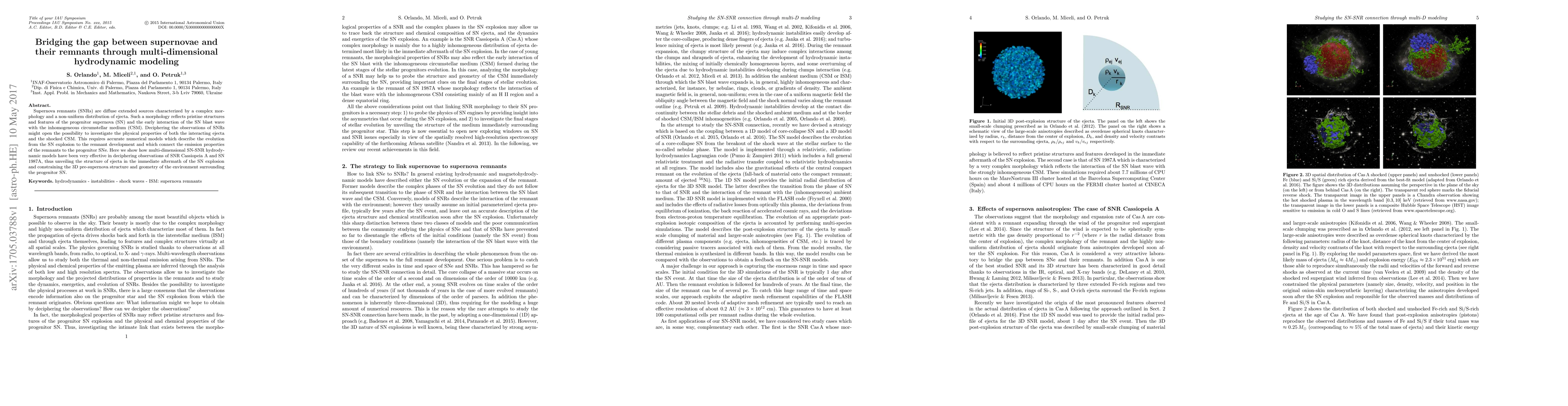 This paper demonstrates how multi-dimensional hydrodynamic modeling effectively bridges the gap between supernovae and their remnants, revealing the ejecta structure and constraining the pre-supernova environment through detailed analysis of SNR Cassiopeia A and SN 1987A. Accurate numerical models connect the progenitor supernova's properties to the evolution and emission characteristics of the resulting remnants.