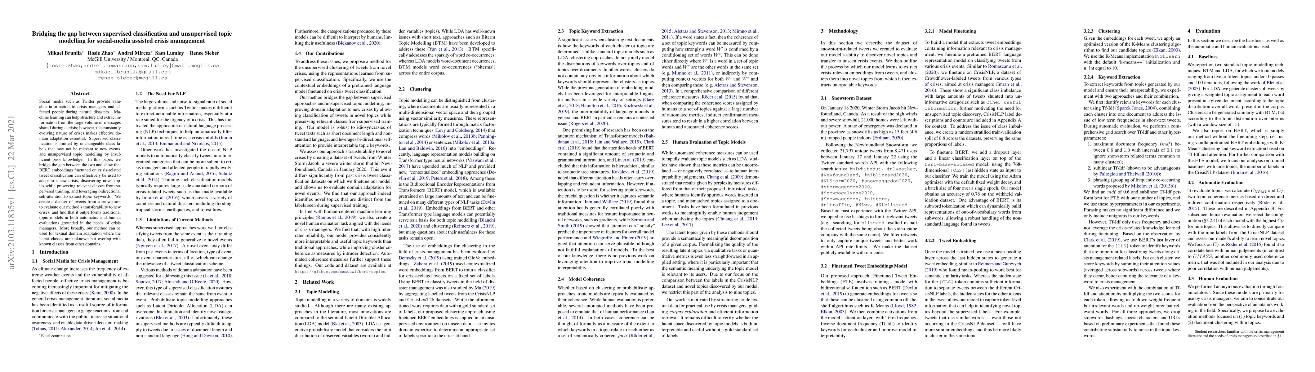 This paper proposes a hybrid approach using BERT embeddings finetuned on crisis-related tweet classification to bridge supervised classification and unsupervised topic modelling, enabling effective domain adaptation for social media-assisted crisis management. The method outperforms traditional topic models in discovering new topics while preserving relevant classes, as demonstrated through a dataset of tweets from a snowstorm.